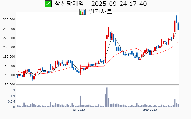 2025년 9월 24일 기준 최근 3일간 52주/역사적 신고가를 돌파한 종목 리스트를 한눈에 볼 수 있도록 정리했습니다. 돌파 이후 주가 흐름 및 돌파 후 조정(눌림) 종목 확인 가능합니다. 더욱 자세한 정보는 AWAKE 신고가 모니터링 채널(https://t.me/awake_realtimeCheck)에서 확인하세요. 🔥 🚀 시장에서 강하고 수급이 집중되는 종목을 가장 빠르게 확인하고 싶다면, ⭐️⭐️신고가 플러스 소개(아래 링크를 클릭하세요)⭐️⭐️ https://fishy-trampoline-79b.notion.site/1-1bd75164780f8043a665e84ea5e17548 ![]() ✅ 아이센스 ❗️ 당일 52주 최고가 돌파 (🔍 최고가 대비 : 3.6% 조정 상태) 거래대금 : 25억(최근 20일 평균) 시가총액 : 5,586억 현재주가 : 20,250원 - 52주 최고가 : 20,500원(52주) - 사상 최고가 : 39,150원(-52.4%) --------------------------------------------------- ![]() ✅ 메디포스트 ❗️ 당일 52주 최고가 돌파 (🔍 최고가 대비 : 1.2% 조정 상태) 거래대금 : 24억(최근 20일 평균) 시가총액 : 5,133억 현재주가 : 15,000원 - 52주 최고가 : 15,030원(52주) - 사상 최고가 : 73,820원(-10.2%) --------------------------------------------------- ![]() ✅ 인바디 ❗️ 당일 52주 최고가 돌파 (🔍 최고가 대비 : 1.3% 조정 상태) 거래대금 : 8억(최근 20일 평균) 시가총액 : 3,950억 현재주가 : 29,300원 - 52주 최고가 : 29,450원(52주) - 사상 최고가 : 58,600원(-28.7%) --------------------------------------------------- ![]() ✅ 쓰리빌리언 ❗️ 당일 역사적 최고가 돌파 (🔍 최고가 대비 : 0.1% 조정 상태) 거래대금 : 48억(최근 20일 평균) 시가총액 : 2,623억 현재주가 : 8,270원 - 역사적 최고가 : 8,270원(52주) --------------------------------------------------- ![]() ✅ 에스엠벡셀 ❗️ 당일 52주 최고가 돌파 (🔍 최고가 대비 : 1.2% 조정 상태) 거래대금 : 2억(최근 20일 평균) 시가총액 : 2,264억 현재주가 : 2,035원 - 52주 최고가 : 2,035원(52주) - 사상 최고가 : 12,962원(-84.2%) --------------------------------------------------- ![]() ✅ 한미약품 ❗️ 1일전 52주 최고가 돌파 (🔍 최고가 대비 : 1.0% 조정 상태) 거래대금 : 351억(최근 20일 평균) 시가총액 : 5.0조 현재주가 : 392,500원 - 52주 최고가 : 395,500원(52주) - 사상 최고가 : 696,469원(+747.3%) --------------------------------------------------- ![]() ✅ 샘씨엔에스 ❗️ 1일전 52주 최고가 돌파 (🔍 최고가 대비 : 0.3% 조정 상태) 거래대금 : 72억(최근 20일 평균) 시가총액 : 4,332억 현재주가 : 7,420원 - 52주 최고가 : 7,420원(52주) - 사상 최고가 : 9,780원(-88.1%) --------------------------------------------------- ![]() ✅ 대덕 ❗️ 1일전 52주 최고가 돌파 (🔍 최고가 대비 : 1.9% 조정 상태) 거래대금 : 6억(최근 20일 평균) 시가총액 : 2,931억 현재주가 : 8,650원 - 52주 최고가 : 8,720원(52주) - 사상 최고가 : 12,812원(-84.4%) --------------------------------------------------- ![]() ✅ 큐알티 ❗️ 1일전 52주 최고가 돌파 (🔍 최고가 대비 : 3.7% 조정 상태) 거래대금 : 25억(최근 20일 평균) 시가총액 : 2,274억 현재주가 : 18,500원 - 52주 최고가 : 19,150원(52주) - 사상 최고가 : 41,700원(-49.3%) --------------------------------------------------- ![]() ✅ 에이치이엠파마 ❗️ 1일전 역사적 최고가 돌파 (🔍 최고가 대비 : 0.7% 조정 상태) 거래대금 : 14억(최근 20일 평균) 시가총액 : 1,879억 현재주가 : 26,550원 - 역사적 최고가 : 26,550원(52주) --------------------------------------------------- ![]() ✅ 텔코웨어 ❗️ 1일전 역사적 최고가 돌파 (🔍 최고가 대비 : 11.5% 조정 상태) 거래대금 : 15억(최근 20일 평균) 시가총액 : 1,546억 현재주가 : 16,730원 - 역사적 최고가 : 21,800원(52주) --------------------------------------------------- ![]() ✅ 삼천당제약 ❗️ 2일전 역사적 최고가 돌파 (🔍 최고가 대비 : 11.5% 조정 상태) 거래대금 : 388억(최근 20일 평균) 시가총액 : 5.6조 현재주가 : 237,500원 - 역사적 최고가 : 266,500원(52주) --------------------------------------------------- ![]() ✅ 리노공업 ❗️ 2일전 52주 최고가 돌파 (🔍 최고가 대비 : 3.8% 조정 상태) 거래대금 : 252억(최근 20일 평균) 시가총액 : 4.1조 현재주가 : 53,400원 - 52주 최고가 : 54,800원(52주) - 사상 최고가 : 59,669원(-27.4%) --------------------------------------------------- ![]() ✅ CJ ENM ❗️ 2일전 52주 최고가 돌파 (🔍 최고가 대비 : 5.3% 조정 상태) 거래대금 : 71억(최근 20일 평균) 시가총액 : 1.7조 현재주가 : 77,900원 - 52주 최고가 : 81,900원(52주) - 사상 최고가 : 286,400원(+248.4%) --------------------------------------------------- ![]() ✅ 파두 ❗️ 2일전 52주 최고가 돌파 (🔍 최고가 대비 : 2.0% 조정 상태) 거래대금 : 113억(최근 20일 평균) 시가총액 : 1.2조 현재주가 : 24,650원 - 52주 최고가 : 24,950원(52주) - 사상 최고가 : 45,000원(-45.3%) --------------------------------------------------- ![]() ✅ 인벤티지랩 ❗️ 2일전 역사적 최고가 돌파 (🔍 최고가 대비 : 19.0% 조정 상태) 거래대금 : 305억(최근 20일 평균) 시가총액 : 5,315억 현재주가 : 49,400원 - 역사적 최고가 : 56,000원(52주) --------------------------------------------------- ![]() ✅ 제우스 ❗️ 2일전 52주 최고가 돌파 (🔍 최고가 대비 : 6.0% 조정 상태) 거래대금 : 45억(최근 20일 평균) 시가총액 : 4,901억 현재주가 : 15,800원 - 52주 최고가 : 16,170원(52주) - 사상 최고가 : 22,700원(-72.4%) --------------------------------------------------- ![]() ✅ 아스