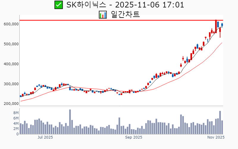2025년 11월 6일 기준 52주/역사적 신고가에 근접한 종목 리스트를 한눈에 볼 수 있도록 정리했습니다. 더욱 자세한 정보는 AWAKE 신고가 모니터링 채널(https://t.me/awake_realtimeCheck)에서 확인하세요. 🔥 🚀 시장에서 강하고 수급이 집중되는 종목을 가장 빠르게 확인하고 싶다면, ⭐️⭐️신고가 플러스 소개(아래 링크를 클릭하세요)⭐️⭐️ https://fishy-trampoline-79b.notion.site/1-1bd75164780f8043a665e84ea5e17548 ![]() ✅ SK하이닉스 🔍 역사적 최고가 4.6% 남음 거래대금 : 3.1조 시가총액 : 431.7조 현재주가 : 593,000원 - 역사적 최고가 : 620,000원(+4.6%) --------------------------------------------------- ![]() ✅ LG에너지솔루션 🔍 52주 최고가 9.4% 남음 거래대금 : 2,883억 시가총액 : 110.0조 현재주가 : 470,000원 - 52주 최고가 : 514,000원(+9.4%) - 사상 최고가 : 624,000원(+659.1%) --------------------------------------------------- ![]() ✅ SK스퀘어 🔍 역사적 최고가 8.0% 남음 거래대금 : 1,582억 시가총액 : 35.8조 현재주가 : 270,000원 - 역사적 최고가 : 291,500원(+8.0%) --------------------------------------------------- ![]() ✅ 하나금융지주 🔍 역사적 최고가 3.8% 남음 거래대금 : 1,762억 시가총액 : 25.9조 현재주가 : 93,000원 - 역사적 최고가 : 96,500원(+3.8%) --------------------------------------------------- ![]() ✅ 삼성화재 🔍 역사적 최고가 5.0% 남음 거래대금 : 801억 시가총액 : 22.7조 현재주가 : 493,500원 - 역사적 최고가 : 518,000원(+5.0%) --------------------------------------------------- ![]() ✅ 효성중공업 🔍 역사적 최고가 9.0% 남음 거래대금 : 2,314억 시가총액 : 21.0조 현재주가 : 2,255,000원 - 역사적 최고가 : 2,458,000원(+9.0%) --------------------------------------------------- ![]() ✅ 우리금융지주 🔍 역사적 최고가 1.5% 남음 거래대금 : 1,045억 시가총액 : 19.5조 현재주가 : 26,600원 - 역사적 최고가 : 27,000원(+1.5%) --------------------------------------------------- ![]() ✅ 삼성전기 🔍 역사적 최고가 6.0% 남음 거래대금 : 1,152억 시가총액 : 17.3조 현재주가 : 232,000원 - 역사적 최고가 : 246,000원(+6.0%) --------------------------------------------------- ![]() ✅ HD현대 🔍 역사적 최고가 6.7% 남음 거래대금 : 787억 시가총액 : 17.1조 현재주가 : 216,500원 - 역사적 최고가 : 231,000원(+6.7%) --------------------------------------------------- ![]() ✅ 두산 🔍 역사적 최고가 2.7% 남음 거래대금 : 1,876억 시가총액 : 16.4조 현재주가 : 991,000원 - 역사적 최고가 : 1,018,000원(+2.7%) --------------------------------------------------- ![]() ✅ LG전자 🔍 52주 최고가 3.8% 남음 거래대금 : 2,067억 시가총액 : 14.9조 현재주가 : 91,700원 - 52주 최고가 : 95,200원(+3.8%) - 사상 최고가 : 185,000원(+125.1%) --------------------------------------------------- ![]() ✅ LS ELECTRIC 🔍 역사적 최고가 8.8% 남음 거래대금 : 1,422억 시가총액 : 13.9조 현재주가 : 462,500원 - 역사적 최고가 : 503,000원(+8.8%) --------------------------------------------------- ![]() ✅ LG 🔍 52주 최고가 4.3% 남음 거래대금 : 937억 시가총액 : 13.3조 현재주가 : 86,500원 - 52주 최고가 : 90,200원(+4.3%) - 사상 최고가 : 119,500원(+45.4%) --------------------------------------------------- ![]() ✅ 한국금융지주 🔍 역사적 최고가 6.8% 남음 거래대금 : 566억 시가총액 : 9.5조 현재주가 : 171,000원 - 역사적 최고가 : 182,600원(+6.8%) --------------------------------------------------- ![]() ✅ SK바이오팜 🔍 52주 최고가 7.9% 남음 거래대금 : 559억 시가총액 : 9.4조 현재주가 : 119,500원 - 52주 최고가 : 129,000원(+7.9%) - 사상 최고가 : 219,000원(+166.4%) --------------------------------------------------- ![]() ✅ 이수페타시스 🔍 역사적 최고가 5.1% 남음 거래대금 : 1,810억 시가총액 : 8.1조 현재주가 : 110,600원 - 역사적 최고가 : 116,200원(+5.1%) --------------------------------------------------- ![]() ✅ 키움증권 🔍 역사적 최고가 5.3% 남음 거래대금 : 342억 시가총액 : 7.7조 현재주가 : 291,000원 - 역사적 최고가 : 306,500원(+5.3%) --------------------------------------------------- ![]() ✅ LS 🔍 역사적 최고가 4.4% 남음 거래대금 : 667억 시가총액 : 6.9조 현재주가 : 217,500원 - 역사적 최고가 : 227,000원(+4.4%) --------------------------------------------------- ![]() ✅ LG유플러스 🔍 52주 최고가 0.7% 남음 거래대금 : 227억 시가총액 : 6.6조 현재주가 : 15,390원 - 52주 최고가 : 15,500원(+0.7%) - 사상 최고가 : 18,400원(-77.6%) --------------------------------------------------- ![]() ✅ 엘앤에프 🔍 52주 최고가 15.1% 남음 거래대금 : 912억 시가총액 : 4.6조 현재주가 : 127,700원 - 52주 최고가 : 147,000원(+15.1%) - 사상 최고가 : 340,000원(+313.6%) --------------------------------------------------- ![]() ✅ 리노공업 🔍 52주 최고가 2.3% 남음 거래대금 : 317억 시가총액 : 4.4조 현재주가 : 57,600원 - 52주 최고가 : 58,900원(+2.3%) - 사상 최고가 : 59,669원(-27.4%) --------------------------------------------------- ![]() ✅ KCC 🔍 52주 최고가 8.1% 남음 거래대금 : 132억 시가총액 : 3.7조 현재주가 : 419,000원 - 52주 최고가 : 453,000원(+8.1%) - 사상 최고가 : 520,620원(+533.4%) --------------------------------------------------- ![]() ✅ 더존비즈온 🔍 52주 최고가 1.1% 남음 거래대금 : 196억 시가총액 : 2.8조 현재주가 : 93,400원 - 52주 최고가 : 95,100원(+1.1%) - 사상 최고가 : 127,500원(+55.1%) --------------------------------------------------- ![]() 