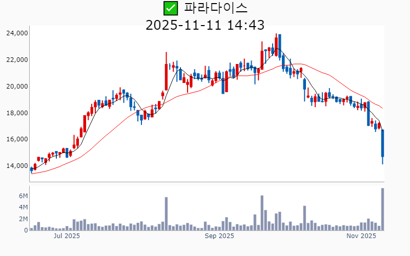 2025년 11월 11일 기준 장중 잠정수급 외국인 순매도 상위 20종목의 정보를 한눈에 볼 수 있도록 정리했습니다. 더욱 자세한 정보는 AWAKE 신고가 모니터링 채널(https://t.me/awake_realtimeCheck)에서 확인하세요. 🔥 🚀 훨씬 깊이있는 장중수급 정보(매수/매도 전환, 신규유입, 업종별 강도 등)을 확인하고 싶다면, ⭐️⭐️신고가 플러스 소개(아래 링크를 클릭하세요)⭐️⭐️ https://fishy-trampoline-79b.notion.site/1-1bd75164780f8043a665e84ea5e17548 ![]() ✅ 파라다이스(시총 : 1.4조) -14.4% - 외국인 매도 - 투신, 보험 매도 --------------------------------------------------- ![]() ✅ SK하이닉스(시총 : 445.5조) +1.0% - 외국인 매도 - 연기금, 투신 매수 --------------------------------------------------- ![]() ✅ 하이브(시총 : 12.0조) -6.5% - 외국인 매도 - 투신, 연기금 매도 --------------------------------------------------- ![]() ✅ 휴림로봇(시총 : 6,773억) -8.8% - 외국인 매도 --------------------------------------------------- ![]() ✅ 코스맥스(시총 : 1.8조) -17.5% - 외국인 매도 - 연기금, 투신 매도 --------------------------------------------------- ![]() ✅ 켐트로닉스(시총 : 5,457억) -7.2% - 외국인 매도 - 투신 매수 --------------------------------------------------- ![]() ✅ 올릭스(시총 : 2.4조) -7.8% - 외국인 매도 - 연기금 매도 --------------------------------------------------- ![]() ✅ 고영(시총 : 1.3조) -4.5% - 외국인 매도 - 투신, 보험 매도 --------------------------------------------------- ![]() ✅ 실리콘투(시총 : 2.5조) -6.3% - 외국인 매도 - 연기금, 투신 매수 --------------------------------------------------- ![]() ✅ 노타(시총 : 9,290억) -20.9% - 외국인 매도 --------------------------------------------------- ![]() ✅ 한국콜마(시총 : 1.5조) -4.4% - 외국인 매도 - 투신, 연기금 매도 --------------------------------------------------- ![]() ✅ 이수페타시스(시총 : 8.5조) -0.8% - 외국인 매도 - 투신 매수 --------------------------------------------------- ![]() ✅ JYP Ent.(시총 : 2.5조) -2.2% - 외국인 매도 - 연기금 매도 --------------------------------------------------- ![]() ✅ 일동제약(시총 : 8,305억) -3.0% - 외국인 매도 - 투신, 연기금 매도 --------------------------------------------------- ![]() ✅ 인벤티지랩(시총 : 6,890억) -5.6% - 외국인 매도 - 투신, 연기금 매수 --------------------------------------------------- ![]() ✅ 뉴로핏(시총 : 2,938억) +0.6% - 외국인 매도 - 투신 매수 --------------------------------------------------- ![]() ✅ 클로봇(시총 : 9,959억) +1.3% - 외국인 매도 - 투신 매수 --------------------------------------------------- ![]() ✅ 로보스타(시총 : 7,654억) +0.8% - 외국인 매도 --------------------------------------------------- ![]() ✅ 삼성전자(시총 : 610.3조) +2.5% - 외국인 매도 - 보험, 연기금 매수 --------------------------------------------------- ![]() ✅ 삼성중공업(시총 : 23.2조) -2.6% - 외국인 매도 - 투신, 보험 매도 --------------------------------------------------- |