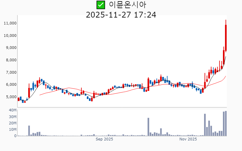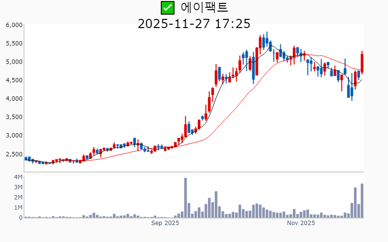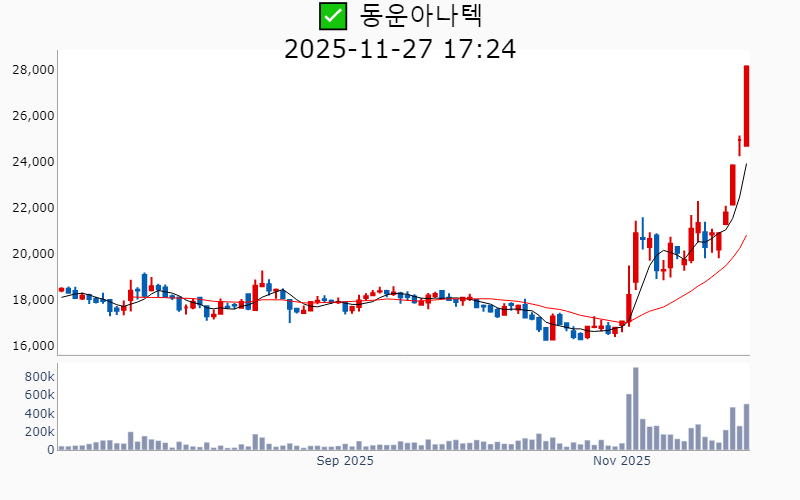 2025년 11월 27일 기준 주간 상승률 상위 15종목의 정보를 한눈에 볼 수 있도록 정리했습니다. 더욱 자세한 정보는 AWAKE 마켓브리핑 채널(https://t.me/awake_realtimeCheck)에서 확인하세요. 🔥 🚀 시장에서 강하고 수급이 집중되는 종목을 가장 빠르게 확인하고 싶다면, ⭐️⭐️신고가 플러스 소개(아래 링크를 클릭하세요)⭐️⭐️ https://fishy-trampoline-79b.notion.site/1d175164780f803e93abc1e53c38b42c ![]() ✅ 천일고속(시총 : 2,004억) 상승률(5D) : +119.5% 종목섹터 : 밸류업 - 서울고속버스터미널 재개발 소식에 따른 기대감 - 강남고속터미널 초고층 개발 계획 발표에 따른 호재 --------------------------------------------------- ![]() ✅ 그래피(시총 : 1,938억) 상승률(5D) : +62.6% 종목섹터 : 의료기기 - 투명교정장치의 미국 FDA 승인으로 60조 규모의 글로벌 시장 진출 본격화 기대감 - 오버행 해소와 함께 미국 시장 진출 소식에 따른 투자심리 개선 호재 --------------------------------------------------- ![]() ✅ 이뮨온시아(시총 : 6,504억) 상승률(5D) : +52.0% 종목섹터 : 바이오/헬스케어 - 면역항암제 후보물질 '댄버스토투그'의 희귀의약품 지정 신청 소식에 따른 기대감. - 면역항암제 관련주 테마 강세 속 외국인 매수 증가에 따른 호재. --------------------------------------------------- ![]() ✅ 노타(시총 : 1.1조) 상승률(5D) : +45.6% 종목섹터 : AI S/W - 삼성전자에 엑시노스 AI 최적화 기술 공급 계약 체결 소식에 따른 기대감. - AI 관련주 전반의 상승세 속에서 기술 경쟁력 강화 전망. --------------------------------------------------- ![]() ✅ 삼현(시총 : 1.0조) 상승률(5D) : +44.4% 종목섹터 : 방산/ 자동차/ HEV/ 로봇 - 빅테크 2곳에 휴머노이드 관절 공급 수주 임박 소식에 따른 기대감. - 로봇 관련주 강세 속 액츄레이터 매집 유효 탑픽으로 부각된 호재. --------------------------------------------------- ![]() ✅ 스맥(시총 : 3,146억) 상승률(5D) : +43.2% 종목섹터 : 로봇/ 드론/UAM - SNT홀딩스의 경영 참여 선언과 지분 20% 확보로 인한 경영권 강화 기대감 - 정부 선정 AI 팩토리 핵심기업으로서의 성장 가능성 부각 --------------------------------------------------- ![]() ✅ 동운아나텍(시총 : 5,217억) 상승률(5D) : +36.8% 종목섹터 : 폴더블/모바일 - 글로벌 최초 침 혈당측정기 상용화 기대감 - 삼성전자 신제품 출시 수혜로 인한 실적 성장 전망 --------------------------------------------------- ![]() ✅ 코오롱모빌리티그룹(시총 : 6,629억) 상승률(5D) : +34.6% 종목섹터 : - 상장폐지 예정 속 단기 급등에 따른 투기적 매수세 유입 기대감 - 중고차 신사업에서의 성과 기대감 --------------------------------------------------- ![]() ✅ 에이팩트(시총 : 1,944억) 상승률(5D) : +28.7% 종목섹터 : 반도체 - 차세대 D램 모듈 SOCAMM2의 단독 수주 및 내년 1월 본격 양산 기대감. - 반도체 장비 관련주 상승세 속 SOCAMM2 테스트 양산 준비 호재. --------------------------------------------------- ![]() ✅ 파두(시총 : 1.2조) 상승률(5D) : +28.5% 종목섹터 : 반도체 - AI 데이터센터 수혜에 따른 SSD 중요성 부각 및 대형 수주 지속 기대감 - 대만 기업과의 첫 모듈 공급 계약을 통한 아시아 시장 공략 확대 전망 --------------------------------------------------- ![]() ✅ ISC(시총 : 2.2조) 상승률(5D) : +28.1% 종목섹터 : 반도체 - 트럼프 행정부의 엔비디아 칩 수출 통제 해제 검토 소식에 반도체주 상승. - 주문형반도체 시장 확대 속 대면적 소켓 공급 확대 모멘텀. --------------------------------------------------- ![]() ✅ 사피엔반도체(시총 : 2,441억) 상승률(5D) : +25.0% 종목섹터 : 메타버스/XR/ 반도체 - AR 글라스 제품 출시와 스마트글라스 시장의 개화 기대감. - 마이크로 LED 디스플레이 엔진 제조기업과의 58억 계약 체결 호재. --------------------------------------------------- ![]() ✅ 한라캐스트(시총 : 3,979억) 상승률(5D) : +24.7% 종목섹터 : 로봇 - 휴머노이드 AI 로봇 부품 양산 준비 및 수주 1.15조 돌파 소식 - 로봇 관련주 전반적인 강세 속 경량 소재 강점 부각 --------------------------------------------------- ![]() ✅ 케이아이엔엑스(시총 : 5,470억) 상승률(5D) : +24.0% 종목섹터 : 데이터센터 - 행동주의 펀드 '가비아'의 공개매수 소식으로 인한 기대감. - 글로벌 클라우드 네트워크 구성 전략 발표에 따른 긍정적 전망. --------------------------------------------------- ![]() ✅ 삼성전기우(시총 : 19.2조) 상승률(5D) : +22.3% 종목섹터 : - 업황 개선 전망과 함께 52주 신고가 경신에 따른 투자자들의 긍정적 반응. - 높은 배당 수익률에 대한 투자자들의 관심 증가. --------------------------------------------------- |