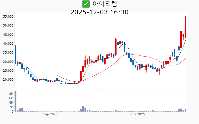 2025년 12월 3일 기준 주간 상승률 상위 15종목의 정보를 한눈에 볼 수 있도록 정리했습니다. 더욱 자세한 정보는 AWAKE 마켓브리핑 채널(https://t.me/awake_realtimeCheck)에서 확인하세요. 🔥 🚀 시장에서 강하고 수급이 집중되는 종목을 가장 빠르게 확인하고 싶다면, ⭐️⭐️신고가 플러스 소개(아래 링크를 클릭하세요)⭐️⭐️ https://fishy-trampoline-79b.notion.site/1d175164780f803e93abc1e53c38b42c ![]() ✅ 아이티켐(시총 : 5,681억) 상승률(5D) : +61.6% 종목섹터 : 바이오/헬스케어 - 코스닥 상장 첫날 100% 가까이 급등한 '따블' 기록 - OLED 중수 재활용설비 9배 확대 계획 발표 통한 성장 기대감 --------------------------------------------------- ![]() ✅ 링크솔루션(시총 : 2,098억) 상승률(5D) : +60.2% 종목섹터 : 로봇 - 삼성·LG 등 대기업과의 실시간 대량 양산 기술 협력 소식으로 인한 기대감 - 방산 및 로봇 분야의 신규 수주 증가로 인한 긍정적 전망 --------------------------------------------------- ![]() ✅ 고영(시총 : 1.9조) 상승률(5D) : +47.8% 종목섹터 : 로봇/ 의료AI - 뇌수술 로봇의 미국 FDA 인증 및 첫 출하로 인한 해외 진출 본격화 기대감. - 3분기 영업이익 576% 급증과 사상 최대 매출 달성에 따른 실적 호조. --------------------------------------------------- ![]() ✅ 코칩(시총 : 1,191억) 상승률(5D) : +47.7% 종목섹터 : 반도체/ 기판/ 2차전지/ 전고체 배터리 - 오라클·오픈AI의 초대형 AI 공급계약에 따른 스타게이트 핵심 부품사로 부각 기대감. - 삼성·오픈AI 동맹에 MLCC 공급 부각으로 인한 주가 상승 전망. --------------------------------------------------- ![]() ✅ 한국피아이엠(시총 : 3,843억) 상승률(5D) : +41.8% 종목섹터 : 로봇 - 휴머노이드 로봇 손 감속기 본격 진출 소식에 따른 기술력 부각 - 글로벌 휴머노이드 시장 공략을 위한 핵심 초정밀 소재 기술 확보 기대감 --------------------------------------------------- ![]() ✅ 인벤티지랩(시총 : 8,720억) 상승률(5D) : +38.8% 종목섹터 : 비만 치료제/ 바이오/헬스케어 - 베링거인겔하임과의 물질이전계약 체결 소식에 따른 기대감. - 장기지속형 주사제 연구 및 상업화 가능성 제시로 인한 긍정적 전망. --------------------------------------------------- ![]() ✅ 미래컴퍼니(시총 : 1,533억) 상승률(5D) : +38.4% 종목섹터 : 전고체 배터리 - 수술로봇 '레보아이'의 차세대 세계일류상품 선정 소식으로 인한 기대감. - 파라과이 및 남미 시장으로의 수출 확대에 따른 글로벌 시장 다변화 호재. --------------------------------------------------- ![]() ✅ 대성산업(시총 : 2,169억) 상승률(5D) : +38.0% 종목섹터 : 유가 - 자본준비금 2692억원 감액으로 배당 재원 확보 및 배당 확대 기대감. - 전기차 충전 서비스 신사업 추진에 따른 미래 성장 가능성 확대 전망. --------------------------------------------------- ![]() ✅ 뉴로핏(시총 : 3,055억) 상승률(5D) : +37.8% 종목섹터 : 의료AI - 일본 의료센터에 '뉴로핏 아쿠아' 공급 계약 체결로 글로벌 시장 진출 가속화 기대감. - AI 뇌자극 성과 발표 후 의식장애 치료 임상에 대한 관심 집중. --------------------------------------------------- ![]() ✅ 큐렉소(시총 : 5,617억) 상승률(5D) : +37.7% 종목섹터 : 로봇 - 인공고관절 수술로봇 국내 허가 획득으로 인한 기대감. - 의료로봇 매출국가 다변화에 따른 3분기 흑자전환 전망. --------------------------------------------------- ![]() ✅ 스맥(시총 : 3,863억) 상승률(5D) : +36.1% 종목섹터 : 로봇/ 드론/UAM - SNT그룹의 스맥 인수 가능성 대두와 최대주주 변경 소식에 따른 기대감 - 현대위아 공작기계사업부 인수 완료로 인한 시장 확대 전망 --------------------------------------------------- ![]() ✅ 에스바이오메딕스(시총 : 3,697억) 상승률(5D) : +34.4% 종목섹터 : 바이오/헬스케어 - 파킨슨병 세포치료제 임상 결과가 Cell지에 발표되며 Best-in-Class 입증 - 미국 FDA 임상 3상 직행 가능성에 대한 기대감 --------------------------------------------------- ![]() ✅ 안트로젠(시총 : 2,922억) 상승률(5D) : +34.3% 종목섹터 : - 일본 품목허가 기대감에 따른 주가 상승. - 수포성 표피박리증 치료제의 일본 수출 개시 기대감. --------------------------------------------------- ![]() ✅ 디아이씨(시총 : 3,788억) 상승률(5D) : +34.1% 종목섹터 : 자율주행/ 자동차/부품 - 현대차와의 협력으로 로봇 아틀라스 관절 감속기 공급 논의 부각. - 현대차-엔비디아 'AI 팩토리' 협력 소식에 따른 기대감. --------------------------------------------------- ![]() ✅ YTN(시총 : 2,052억) 상승률(5D) : +33.7% 종목섹터 : 선거 - 법원의 YTN 최대주주 변경 승인 취소 판결로 민영화가 원점으로 돌아가면서 주가 상승 기대감. - 정부의 헐값 매각 전수조사 지시로 인한 불확실성 해소 전망. --------------------------------------------------- |