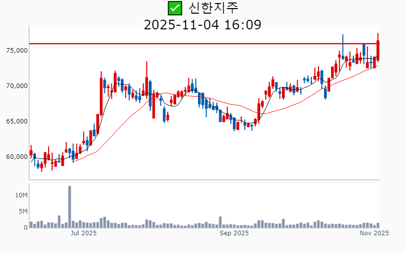- 2025년 11월 4일기준 신고가 종목을 한눈에 볼 수 있도록 정리했습니다. - 실시간 신고가 종목은 Awake 신고가 종목 텔레그램 채널 https://t.me/awake_realtimeCheck 에서 확인하세요. - ⚡ 더욱 깊이있는 신고가 + 수급 정보를 원한다면 AWAKE 신고가 플러스를 이용해 보세요⚡ 👉 https://fishy-trampoline-79b.notion.site/1d175164780f803e93abc1e53c38b42c ⚡ 📌 신고가 종목 현황(2025-11-04기준) ✅ 바이오/헬스케어 (섹터강도 : 4.6) ⭐️⭐️⭐️ (상승률/거래대금) 종목명 (+18.2%/ 1,395억) 한국비엔씨(52주)/ 52주 최대거래 (+17.2%/ 151억) 지노믹트리(52주) (+15.6%/ 92억) 티움바이오(52주) (+12.9%/ 1,063억) 인벤티지랩(역사적) (+12.7%/ 474억) 오스코텍(52주) (+10.9%/ 504억) 보로노이(역사적) ( +9.4%/ 723억) 에이프릴바이오(역사적) ( +7.7%/ 2,276억) 에이비엘바이오(역사적) ( +7.5%/ 2,617억) 디앤디파마텍(역사적) ( +7.0%/ 1,556억) 올릭스(역사적) ( +6.5%/ 2,047억) 한미약품(52주) ( +5.0%/ 5,837억) 알테오젠(역사적) ( +4.5%/ 168억) 오름테라퓨틱(역사적) ( +3.3%/ 22억) 메디포스트(52주) ( +2.6%/ 329억) 로킷헬스케어(역사적) ( +2.4%/ 469억) 인투셀(역사적) ( +1.5%/ 62억) 씨어스테크놀로지(역사적) ( +1.3%/ 399억) 프로티나(역사적) ( +0.9%/ 218억) 셀트리온제약(52주) ( +0.6%/ 10억) JW생명과학(52주) ✅ 반도체 ⭐️ (상승률/거래대금) 종목명 (+20.5%/ 1,865억) 이오테크닉스(역사적)/ 52주 최대거래 (+11.9%/ 1,734억) 필옵틱스(역사적) ( +8.2%/ 437억) 유진테크(역사적) ( +5.4%/ 660억) 원익IPS(역사적) ( +4.8%/ 236억) GST(52주) ( +4.0%/ 68억) 한양디지텍(52주) ( +3.9%/ 59억) 엘티씨(역사적) ( +3.3%/ 84억) 코세스(역사적) ( +2.0%/ 1,226억) 켐트로닉스(역사적) ( +1.7%/ 20억) 싸이맥스(52주) ( +1.6%/ 524억) 리노공업(역사적) ( +1.4%/ 210억) 피에스케이(역사적) ( +1.0%/ 143억) 제이앤티씨(52주) ( +0.5%/ 1,504억) 이수페타시스(역사적) ( +0.5%/ 502억) 파미셀(52주) ( +0.4%/ 337억) 파두(52주) ( +0.3%/ 109억) 넥스틴(52주) ✅ 로봇 (상승률/거래대금) 종목명 (+11.5%/ 664억) LS티라유텍(52주)/ 52주 최대거래 ( +8.5%/ 1,541억) 원익홀딩스(역사적) ( +3.7%/ 115억) 피앤에스로보틱스(52주) ( +3.6%/ 151억) 케이엔알시스템(52주) ( +3.4%/ 1,495억) 휴림로봇(52주) ( +1.9%/ 3,797억) 레인보우로보틱스(역사적) ( +1.5%/ 1,655억) 티로보틱스(52주) ( +0.4%/ 933억) 현대오토에버(52주) ✅ 2차전지 (상승률/거래대금) 종목명 (+18.0%/ 3,497억) 강원에너지(52주) ( +3.2%/ 4,389억) 삼성SDI(52주) ( +0.9%/ 2,847억) 에코프로(52주) ✅ 밸류업 (상승률/거래대금) 종목명 ( +6.9%/ 838억) S-Oil(52주) ( +3.3%/ 1,650억) KB금융(역사적) ( +3.1%/ 1,154억) 신한지주(역사적) ( +2.3%/ 1,000억) LS(역사적) ( +0.7%/ 25억) 일진홀딩스(52주) ( +0.6%/ 10억) JW생명과학(52주) ( +0.6%/ 24억) 미래에셋생명(역사적) ✅ 전력설비 (상승률/거래대금) 종목명 ( +7.8%/ 3,174억) 대한전선(52주) ( +3.0%/ 1,487억) 일진전기(역사적) ( +2.4%/ 237억) 가온전선(역사적) ( +2.3%/ 1,000억) LS(역사적) ( +1.2%/ 270억) 세명전기(52주) ( +0.8%/ 973억) 대원전선(52주) ✅ 폴더블/모바일 (상승률/거래대금) 종목명 ( +2.8%/ 68억) 자화전자(52주) ( +1.8%/ 105억) KH바텍(52주) ✅ 통신장비 (상승률/거래대금) 종목명 ( +1.2%/ 134억) RFHIC(52주) ( +0.1%/ 79억) 케이엠더블유(52주) ----------------------------------- ![]() ✅ KB금융(+3.3%) ❗️ 역사적 신고가 신규 돌파 거래대금 : 1,650억 시가총액 : 46.5조 - 현재가 : 121,900원 종합금융서비스 제공 금융지주회사 금융·유통 협업 및 생산적 금융으로 차별화된 고객 경험 제공 보험 및 비은행 부문 성장으로 리딩금융 지위 강화 📊 주요지표 부채비율 : 1,180% 유보율 : 2,574% PBR : 0.68배 📊 최근실적(매출/영업익/순익) 2025.3Q -/ 21,367억/ 15,531억(E) 2025.2Q 241,229억/ 21,330억/ 17,476억 2025.1Q 197,228억/ 22,930억/ 16,991억 2024.4Q 264,119억/ 10,300억/ 6,587억 2024.3Q 155,047억/ 23,576억/ 23,576억 📊 당일 기관수급 요약 📌 기관합계 : +234억 - 투신 : +125억 - 금융투자 : +104억 - 사모 : +30억 - 보험 : +21억 - 은행 : 0억 - 기타금융 : -1억 - 연기금 : -46억 📌 외국인 : +70억 ![]() ✅ 신한지주(+3.1%) ❗️ 역사적 신고가 돌파 이어감 거래대금 : 1,154억 시가총액 : 37.1조 - 현재가 : 76,400원 종합금융서비스 제공을 통한 안정적 수익 기반 확보. 디지털 전환 및 AI 기술 도입을 통한 금융 혁신 가속화. 해외 대체투자 리스크 관리 및 주주환원 정책 강화. 📊 주요지표 부채비율 : 1,150% 유보율 : 1,771% PBR : 0.52배 📊 최근실적(매출/영업익/순익) 2025.3Q -/ 18,513억/ 13,603억(E) 2025.2Q 232,240억/ 20,143억/ 15,772억 2025.1Q 161,160억/ 19,442억/ 15,170억 2024.4Q 243,481억/ 6,680억/ 4,339억 2024.3Q 116,220억/ 18,699억/ 18,699억 📊 당일 기관수급 요약 📌 기관합계 : +44억 - 투신 : +35억 - 금융투자 : +24억 - 사모 : +14억 - 기타금융 : 0억 - 은행 : 0억 - 보험 : -1억 - 연기금 : -28억 📌 외국인 : +116억 ![]() ✅ 알테오젠(+5.0%) ❗️ 역사적 신고가 돌파 이어감 거래대금 : 5,836억 시가총액 : 29.4조 - 현재가 : 549,000원 바이오 의약품 개발 및 기술이전 전문 기업 키트루다 바이오시밀러 및 ALT-B4 기술이전 통한 글로벌 시장 확장 코스피 이전 상장 추진 및 기술료 수익 증가에 따른 성장성 강화 📊 주요지표 부채비율 : 73% 유보율 : 1,164% PBR : 58.35배 📊 최근실적(매출/영업익/순익) 2025.2Q 186억/ -4억/ -343억 2025.1Q 837억/ 610억/ 830