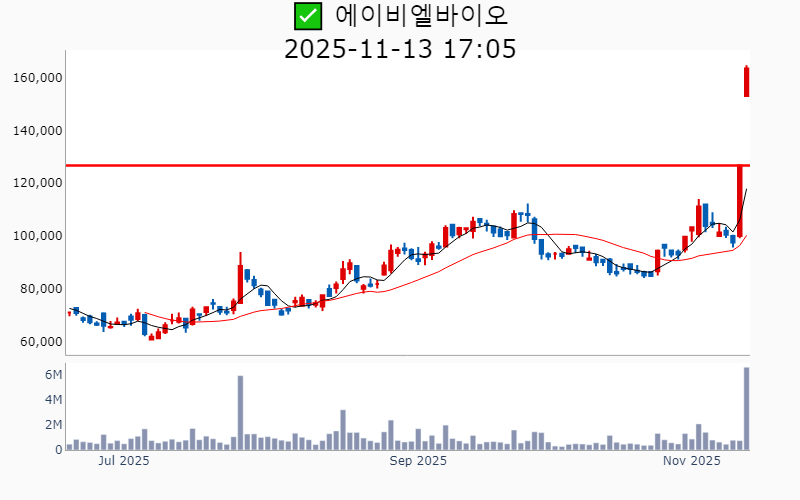 - 2025년 11월 13일기준 신고가 종목을 한눈에 볼 수 있도록 정리했습니다. - 실시간 신고가 종목은 Awake 신고가 종목 텔레그램 채널 https://t.me/awake_realtimeCheck 에서 확인하세요. - ⚡ 더욱 깊이있는 신고가 + 수급 정보를 원한다면 AWAKE 신고가 플러스를 이용해 보세요⚡ 👉 https://fishy-trampoline-79b.notion.site/1d175164780f803e93abc1e53c38b42c ⚡ 📌 신고가 종목 현황(2025-11-13기준) ✅ 바이오/헬스케어 (섹터강도 : 4.9) ⭐️⭐️⭐️ (상승률/거래대금) 종목명 (+28.1%/ 9,901억) 에이비엘바이오(역사적) (+19.7%/ 2,086억) 로킷헬스케어(역사적) (+11.9%/ 137억) 큐리언트(역사적) (+10.2%/ 126억) 엘앤케이바이오(52주) ( +8.9%/ 119억) 앱클론(52주) ( +8.1%/ 1,664억) 에이프릴바이오(역사적) ( +7.6%/ 653억) 퓨쳐켐(52주) ( +7.1%/ 6,019억) 셀트리온(52주) ( +6.8%/ 3,518억) 지투지바이오(역사적) ( +5.3%/ 349억) 일동홀딩스(52주) ( +4.6%/ 391억) 오스코텍(52주) ( +4.0%/ 281억) 와이바이오로직스(역사적) ( +3.4%/ 377억) 셀트리온제약(52주) ( +2.7%/ 327억) 메드팩토(52주) ( +2.0%/ 191억) 씨어스테크놀로지(역사적) ( +1.9%/ 145억) 오름테라퓨틱(역사적) ( +1.8%/ 20억) JW생명과학(52주) ( +1.3%/ 707억) 인벤티지랩(역사적) ( +0.9%/ 2,410억) 알테오젠(역사적) ( +0.5%/ 39억) 코오롱생명과학(52주) ( +0.4%/ 112억) 메지온(52주) ✅ 반도체 (섹터강도 : 4.6) ⭐️⭐️⭐️ (상승률/거래대금) 종목명 (+26.8%/ 499억) 하나머티리얼즈(52주) (+17.9%/ 496억) 한양디지텍(52주)/ 52주 최대거래 (+11.4%/ 1,380억) 디아이(52주) ( +7.0%/ 70억) 티에스이(52주) ( +5.7%/ 387억) 티엘비(역사적) ( +5.2%/ 346억) 이오테크닉스(역사적) ( +5.0%/ 502억) 코리아써키트(52주) ( +2.1%/ 172억) 케이씨텍(52주) ( +1.0%/ 23억) 에스에이엠티(52주) ( +0.8%/ 42억) 코세스(역사적) ( +0.7%/ 1,157억) 이수페타시스(역사적) ✅ 로봇 ⭐️ (상승률/거래대금) 종목명 (+18.8%/ 2,055억) 제닉스로보틱스(52주) ( +7.6%/ 831억) 더블유에스아이(52주)/ 역대 최대거래 ✅ 밸류업 (상승률/거래대금) 종목명 ( +9.5%/ 539억) KG케미칼(52주)/ 52주 최대거래 ( +5.2%/ 32억) 영원무역(52주) ( +2.8%/ 283억) 키움증권(역사적) ( +1.8%/ 20억) JW생명과학(52주) ( +1.5%/ 226억) DB손해보험(역사적) ( +1.4%/ 140억) 신세계(52주) ( +1.0%/ 176억) 한국타이어앤테크놀로지(52주) ( +0.8%/ 388억) S-Oil(52주) ( +0.7%/ 421억) 우리금융지주(역사적) ( +0.7%/ 1억) 한일철강(52주) ( +0.2%/ 333억) 삼성생명(역사적) ( +0.2%/ 698억) 하나금융지주(역사적) ( +0.1%/ 153억) GS(52주) ✅ AI S/W (상승률/거래대금) 종목명 ( +8.4%/ 496억) 쓰리빌리언(역사적) ( +6.0%/ 11억) 가온그룹(52주) ✅ 화학 (상승률/거래대금) 종목명 ( +4.6%/ 137억) SK케미칼(52주) ( +2.6%/ 427억) 롯데케미칼(52주) ✅ 전고체 배터리 (상승률/거래대금) 종목명 ( +4.4%/ 23억) 레몬(52주) ( +2.3%/ 388억) 유니테크노(52주) ✅ 2차전지 (상승률/거래대금) 종목명 ( +1.1%/ 449억) 강원에너지(52주) ( +0.2%/ 4억) 케이엔더블유(52주) ----------------------------------- ![]() ✅ 셀트리온(+6.7%) ❗️ 52주 신고가 신규 돌파 거래대금 : 6,558억 시가총액 : 45.1조 - 현재가 : 195,100원 바이오시밀러 전문 제약기업으로 유럽 시장에서 3종 제품 처방 1위 기록 미국 릴리 공장 인수로 글로벌 생산 역량 및 시장 점유율 확대 추진 소액주주 비대위의 경영 투명성 요구 및 주주권 강화 이슈 부각 📊 주요지표 부채비율 : 23% 유보율 : 7,419% PBR : 2.13배 📊 최근실적(매출/영업익/순익) 2025.3Q 11,346억/ 3,390억/ 2,660억(E) 2025.2Q 9,615억/ 2,425억/ 633억 2025.1Q 8,419억/ 1,494억/ 1,083억 2024.4Q 10,636억/ 1,964억/ 2,356억 2024.3Q 8,819억/ 2,077억/ 2,077억 📊 당일 기관수급 요약 📌 기관합계 : +457억 - 연기금 : +192억 - 사모 : +140억 - 투신 : +61억 - 보험 : +34억 - 금융투자 : +32억 - 은행 : -1억 - 기타금융 : -2억 📌 외국인 : +1,449억 ![]() ✅ LG전자(-0.4%) ❗️ 52주 신고가 신규 돌파 거래대금 : 1,096억 시가총액 : 15.1조 - 현재가 : 92,500원 글로벌 가전 및 전자제품 리더로서 AI 및 전장 사업에서의 혁신 주도. 메르세데스-벤츠와의 협력을 통한 미래 모빌리티 및 AI 기반 전장 솔루션 확대. 유럽 시장에서의 상표권 분쟁 승리와 신제품 출시로 가전 시장 경쟁력 강화. 📊 주요지표 부채비율 : 141% 유보율 : 2,298% PBR : 0.61배 📊 최근실적(매출/영업익/순익) 2025.3Q 210,155억/ 6,077억/ 3,577억(E) 2025.2Q 207,351억/ 6,394억/ 6,096억 2025.1Q 227,398억/ 12,591억/ 8,756억 2024.4Q 227,615억/ 1,353억/ -7,138억 2024.3Q 221,764억/ 7,519억/ 7,519억 📊 당일 기관수급 요약 📌 기관합계 : -136억 - 사모 : +5억 - 보험 : +0억 - 기타금융 : +0억 - 은행 : 0억 - 투신 : 0억 - 연기금 : -25억 - 금융투자 : -115억 📌 외국인 : +45억 ![]() ✅ DB손해보험(+0.6%) ❗️ 역사적 신고가 신규 돌파 거래대금 : 392억 시가총액 : 10.2조 - 현재가 : 144,000원 종합 손해보험 서비스 및 금융 상품 제공 기업 현대카드와의 제휴를 통한 고객 혜택 강화 및 금융 서비스 다각화 글로벌 확장 및 디지털 혁신을 통한 장기 성장 전략 추진 📊 주요지표 부채비율 : 676% 유보율 : 35,902% PBR : 0.83배 📊 최근실적(매출/영업익/순익) 2025.3Q -/ 5,464억/ 4,120억(E) 2025.2Q 66,791억/ 7,985억/ 6,523억 2025.1Q 56,202억/ 6,198억/ 4,314억 2024.4Q 63,091억/ 2,499억/ 1,867억 2024.3Q 47,236억/ 6,290억/ 6,290억 📊 당일 기관수급 요약 📌 기관합계 : +9억 - 연기금 : +29억 - 