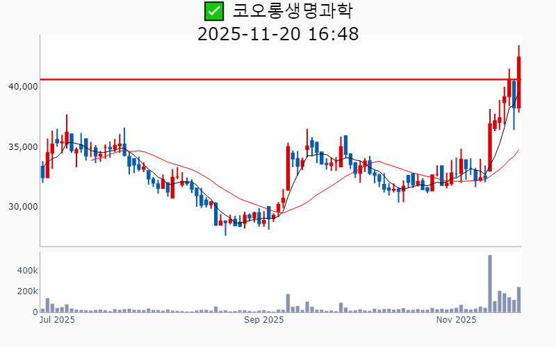 - 2025년 11월 20일기준 신고가 종목을 한눈에 볼 수 있도록 정리했습니다. - 실시간 신고가 종목은 Awake 신고가 종목 텔레그램 채널 https://t.me/awake_realtimeCheck 에서 확인하세요. - ⚡ 더욱 깊이있는 신고가 + 수급 정보를 원한다면 AWAKE 신고가 플러스를 이용해 보세요⚡ 👉 https://fishy-trampoline-79b.notion.site/1d175164780f803e93abc1e53c38b42c ⚡ 📌 신고가 종목 현황(2025-11-20기준) ✅ 바이오/헬스케어 (섹터강도 : 4.5) ⭐️⭐️ (상승률/거래대금) 종목명 (+15.4%/ 2,003억) 펩트론(역사적) (+14.8%/ 1,841억) 로킷헬스케어(역사적) (+14.6%/ 263억) 앱클론(52주) (+11.0%/ 102억) 코오롱생명과학(52주) (+10.1%/ 363억) 오스코텍(52주) ( +8.7%/ 60억) 에이치이엠파마(역사적) ( +8.4%/ 435억) 보로노이(역사적) ( +8.4%/ 390억) 코오롱티슈진(52주) ( +5.6%/ 336억) 퓨쳐켐(역사적) ( +4.4%/ 3,094억) 에이비엘바이오(역사적) ( +3.9%/ 118억) 일동홀딩스(52주) ( +2.4%/ 1,881억) 알테오젠(역사적) ✅ 여행/카지노 ⭐️ (상승률/거래대금) 종목명 (+15.0%/ 938억) 롯데관광개발(52주)/ 52주 최대거래 (+11.2%/ 392억) 서부T&D(52주) ✅ 전력설비 ⭐️ (상승률/거래대금) 종목명 (+17.1%/ 839억) 롯데에너지머티리얼즈(52주) ( +6.5%/ 2,042억) LS ELECTRIC(역사적) ✅ 로봇 ⭐️ (상승률/거래대금) 종목명 (+11.1%/ 428억) 한국피아이엠(역사적) (+10.8%/ 2,857억) 에스피지(역사적) ( +2.2%/ 24억) HL홀딩스(52주) ✅ 밸류업 (상승률/거래대금) 종목명 ( +8.2%/ 72억) 대원산업(역사적) ( +4.0%/ 24억) 일진홀딩스(52주) ( +3.3%/ 5억) 일신방직(52주) ( +3.2%/ 12억) 삼지전자(52주) ( +3.1%/ 202억) 신세계(52주) ( +2.2%/ 24억) HL홀딩스(52주) ( +1.8%/ 254억) GS(52주) ( +1.4%/ 2억) 대림바스(52주) ( +1.2%/ 131억) 현대백화점(52주) ( +1.1%/ 111억) 영원무역(역사적) ✅ 반도체 (상승률/거래대금) 종목명 ( +9.7%/ 153억) 인터플렉스(52주) ( +4.5%/ 2,358억) 이수페타시스(역사적) ✅ AI S/W (상승률/거래대금) 종목명 (+11.1%/ 43억) 가온그룹(52주) ( +6.2%/ 133억) 쓰리빌리언(역사적) ( +1.6%/ 3억) 케이티알파(52주) ( +1.5%/ 167억) 더존비즈온(52주) ✅ 자동차 (상승률/거래대금) 종목명 ( +4.1%/ 467억) 디아이씨(52주) ( +2.3%/ 4억) 두올(52주) ✅ 식량자원 (상승률/거래대금) 종목명 ( +4.4%/ 20억) 샘표식품(52주) ( +4.4%/ 23억) 이지홀딩스(52주) ✅ 미용 (상승률/거래대금) 종목명 ( +1.6%/ 116억) 한스바이오메드(역사적) ( +1.3%/ 77억) 대웅제약(52주) ----------------------------------- ![]() ✅ 펩트론(+15.4%) ❗️ 역사적 신고가 신규 돌파 거래대금 : 2,004억 시가총액 : 9.0조 - 현재가 : 386,000원 약효 지속형 의약품 개발 및 생산 전문 바이오 기업 글로벌 빅파마와의 기술이전 및 위탁 생산 확대를 통한 파이프라인 강화 장기 지속형 전립선암 치료제 '루프원' 출하로 인한 매출 성장 기대 📊 주요지표 부채비율 : 12% 유보율 : 1,119% PBR : 30.37배 📊 최근실적(매출/영업익/순익) 2025.2Q 14억/ -50억/ -38억 2025.1Q 16억/ -44억/ -33억 2024.4Q 15억/ -35억/ -50억 2024.3Q 6억/ -47억/ -47억 📊 당일 기관수급 요약 📌 기관합계 : +28억 - 사모 : +69억 - 투신 : +18억 - 기타금융 : +0억 - 은행 : 0억 - 보험 : -2억 - 연기금 : -11억 - 금융투자 : -46억 📌 외국인 : +574억 ![]() ✅ 보로노이(+8.4%) ❗️ 역사적 신고가 돌파 이어감 거래대금 : 435억 시가총액 : 4.4조 - 현재가 : 239,000원 표적항암제 개발 및 임상 진행 중인 바이오 기업 VRN10, VRN11 등 혁신적 항암제 임상 성과로 주목받는 신약 개발 역량 VRN04 프로그램 성공적 양도 및 기술수출로 글로벌 시장 진출 가속화 📊 주요지표 부채비율 : 10% 유보율 : 323% PBR : 42.24배 📊 최근실적(매출/영업익/순익) 2025.2Q 34억/ -102억/ -105억 2025.1Q / -145억/ -141억 2024.4Q / -106억/ -89억 2024.3Q / -95억/ -95억 📊 당일 기관수급 요약 📌 기관합계 : +27억 - 연기금 : +27억 - 사모 : +15억 - 보험 : +2억 - 은행 : 0억 - 기타금융 : 0억 - 금융투자 : -5억 - 투신 : -12억 📌 외국인 : +57억 ![]() ✅ 롯데관광개발(+15.0%) ❗️ 52주 신고가 돌파 이어감 거래대금 : 939억 시가총액 : 1.8조 - 현재가 : 22,350원 제주 드림타워를 중심으로 한 카지노 및 관광 사업 확장. 한일협력위원회 개최를 통한 국제 협력 강화 및 관광 수요 증가 기대. 중국 단체관광 재개와 리오프닝 효과로 인한 실적 개선 가능성. 📊 주요지표 부채비율 : 528% 유보율 : -1,054% PBR : 3.87배 📊 최근실적(매출/영업익/순익) 2025.4Q 1,728억/ 379억/ 69억(E) 2025.3Q 1,867억/ 530억/ 65억 2025.2Q 1,577억/ 331억/ 59억 2025.1Q 1,219억/ 130억/ -237억 2024.4Q 1,100억/ 22억/ 22억 📊 당일 기관수급 요약 📌 기관합계 : +33억 - 투신 : +48억 - 연기금 : +35억 - 금융투자 : +8억 - 보험 : +3억 - 기타금융 : +0억 - 은행 : 0억 - 사모 : -62억 📌 외국인 : +217억 ![]() ✅ 에스피지(+10.8%) ❗️ 52주 신고가 돌파 이어감 거래대금 : 2,857억 시가총액 : 9,425억 - 현재가 : 42,500원 로봇용 정밀 감속기 및 액추에이터 전문 기업 LG와의 협력을 통한 로봇 핵심 부품 기술력 강화 및 시장 확장 휴머노이드 액추에이터 양산으로 차별화된 경쟁력 및 성장 동력 확보 📊 주요지표 부채비율 : 61% 유보율 : 1,732% PBR : 2.48배 📊 최근실적(매출/영업익/순익) 2025.3Q 859억/ 46억/ -(E) 2025.2Q 805억/ 39억/ 24억 2025.1Q 933억/ 41억/ 31억 2024.4Q 981억/ 25억/ 40억 2024.3Q 922억/ 33억/ 33억 📊 당일 기관수급 요약 📌 기관합