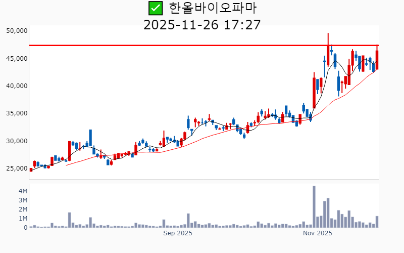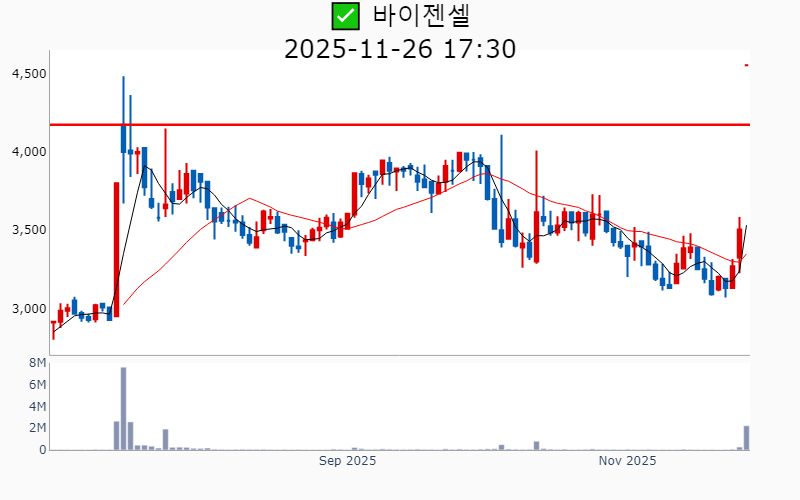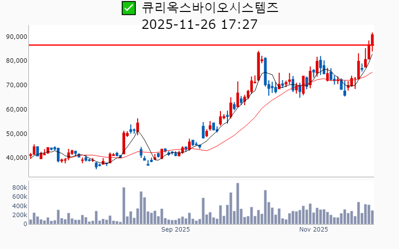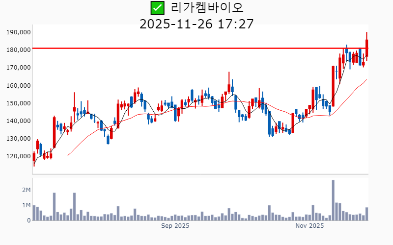 - 2025년 11월 26일기준 신고가 종목을 한눈에 볼 수 있도록 정리했습니다. - 실시간 신고가 종목은 Awake 신고가 종목 텔레그램 채널 https://t.me/awake_realtimeCheck 에서 확인하세요. - ⚡ 더욱 깊이있는 신고가 + 수급 정보를 원한다면 AWAKE 신고가 플러스를 이용해 보세요⚡ 👉 https://fishy-trampoline-79b.notion.site/1d175164780f803e93abc1e53c38b42c ⚡ 📌 신고가 종목 현황(2025-11-26기준) ✅ 바이오/헬스케어 (섹터강도 : 4.7) ⭐️⭐️⭐️ (상승률/거래대금) 종목명 (+16.9%/ 3,239억) 이뮨온시아(역사적) (+15.4%/ 258억) 코오롱생명과학(52주) (+14.6%/ 2,779억) 프로티나(역사적) (+11.6%/ 256억) 앱클론(52주) (+10.9%/ 2,160억) 로킷헬스케어(역사적) (+10.3%/ 610억) 오스코텍(52주) ( +9.2%/ 738억) 코오롱티슈진(52주) ( +9.1%/ 1,233억) SK바이오팜(52주) ( +8.7%/ 587억) 한올바이오파마(52주) ( +7.3%/ 1,589억) 리가켐바이오(역사적) ( +7.2%/ 59억) 에이치이엠파마(역사적) ( +4.9%/ 266억) 큐리옥스바이오시스템즈(역사적) ( +4.8%/ 389억) 보로노이(역사적) ( +1.1%/ 47억) 엘앤케이바이오(52주) ✅ 데이터센터 (상승률/거래대금) 종목명 (+18.6%/ 362억) 케이아이엔엑스(52주)/ 52주 최대거래 ( +0.6%/ 4,584억) 이수페타시스(역사적) ✅ 자동차 ⭐️ (상승률/거래대금) 종목명 (+14.5%/ 1,547억) 삼현(역사적) (+11.0%/ 209억) 코리아에프티(52주) ✅ 밸류업 (상승률/거래대금) 종목명 ( +6.6%/ 33억) 인카금융서비스(역사적) ( +5.4%/ 102억) 영원무역(역사적) ( +4.5%/ 54억) 동성케미컬(52주) ( +4.2%/ 20억) 영원무역홀딩스(역사적) ( +3.4%/ 39억) 에이플러스에셋(52주) ( +3.3%/ 1,459억) 삼성물산(역사적) ( +2.5%/ 3,910억) 한국전력(52주) ( +2.4%/ 7억) 방림(52주) ( +1.6%/ 49억) 제일기획(52주) ( +1.5%/ 5억) 삼지전자(52주) ✅ 반도체 (상승률/거래대금) 종목명 ( +6.4%/ 2,226억) 삼성전기(역사적) ( +2.8%/ 187억) 삼영(역사적) ( +2.2%/ 978억) 리노공업(역사적) ( +1.7%/ 552억) ISC(역사적) ( +0.6%/ 4,584억) 이수페타시스(역사적) ✅ AI S/W (상승률/거래대금) 종목명 ( +4.1%/ 90억) 플리토(역사적) ( +3.5%/ 5억) 케이티알파(52주) ----------------------------------- ![]() ✅ 삼성물산(+3.3%) ❗️ 역사적 신고가 다시 돌파 거래대금 : 1,459억 시가총액 : 40.1조 - 현재가 : 236,000원 건설·패션·상사·리조트 등 다양한 포트폴리오를 보유한 글로벌 종합상사 태양광, 수소, SMR 등 친환경 에너지 사업 확장을 통한 글로벌 에너지 솔루션 리더 목표 AI 네이티브 건설사 전환 및 원전 사업 기대감으로 미래 성장동력 확보 📊 주요지표 부채비율 : 53% 유보율 : 136,490% PBR : 0.73배 📊 최근실적(매출/영업익/순익) 2025.4Q 105,567억/ 8,365억/ 7,909억(E) 2025.3Q 101,510억/ 9,934억/ 8,846억 2025.2Q 100,221억/ 7,526억/ 5,265억 2025.1Q 97,368억/ 7,244억/ 9,372억 2024.4Q 99,928억/ 6,346억/ 6,346억 📊 당일 기관수급 요약 📌 기관합계 : +42억 - 금융투자 : +34억 - 연기금 : +20억 - 투신 : +18억 - 보험 : +13억 - 기타금융 : +0억 - 은행 : 0억 - 사모 : -44억 📌 외국인 : +194억 ![]() ✅ 삼성전기(+6.4%) ❗️ 역사적 신고가 다시 돌파 거래대금 : 2,227억 시가총액 : 19.2조 - 현재가 : 257,000원 전자부품 전문 기업, MLCC 및 반도체 패키징 기판 사업 중심 구조 차세대 MLCC 및 AI 기판 기술 개발을 통한 기술 리더십 강화 임원진 리더십 강화와 R&D 투자로 미래 성장동력 확보 📊 주요지표 부채비율 : 46% 유보율 : 2,033% PBR : 1.59배 📊 최근실적(매출/영업익/순익) 2025.4Q 28,211억/ 2,200억/ 1,740억(E) 2025.3Q 28,890억/ 2,603억/ 2,249억 2025.2Q 27,846억/ 2,130억/ 1,372억 2025.1Q 27,386억/ 2,006억/ 1,416억 2024.4Q 24,923억/ 1,150억/ 1,150억 📊 당일 기관수급 요약 📌 기관합계 : +479억 - 사모 : +207억 - 금융투자 : +150억 - 연기금 : +70억 - 투신 : +29억 - 보험 : +17억 - 은행 : +1억 - 기타금융 : +1억 📌 외국인 : -100억 ![]() ✅ SK바이오팜(+9.1%) ❗️ 52주 신고가 돌파 이어감 거래대금 : 1,233억 시가총액 : 11.0조 - 현재가 : 140,700원 뇌전증 치료제 중심의 신약 개발 전문 기업 엑스코프리와 세노바메이트의 임상 성과를 통한 글로벌 시장 확대 및 안정적 매출 성장 오픈 이노베이션과 연결성 기반의 차세대 성장 동력 확보 📊 주요지표 부채비율 : 49% 유보율 : 1,516% PBR : 11.8배 📊 최근실적(매출/영업익/순익) 2025.4Q 2,017억/ 559억/ 305억(E) 2025.3Q 1,917억/ 701억/ 714억 2025.2Q 1,763억/ 619억/ 295억 2025.1Q 1,444억/ 257억/ 196억 2024.4Q 1,630억/ 407억/ 407억 📊 당일 기관수급 요약 📌 기관합계 : +106억 - 연기금 : +35억 - 금융투자 : +34억 - 투신 : +24억 - 사모 : +12억 - 은행 : 0억 - 기타금융 : 0억 - 보험 : 0억 📌 외국인 : +320억 ![]() ✅ 리가켐바이오(+7.3%) ❗️ 역사적 신고가 돌파 이어감 거래대금 : 1,589억 시가총액 : 6.8조 - 현재가 : 185,600원 항체-약물 접합체(ADC) 중심의 바이오테크 기업 글로벌 제약사와의 기술이전 계약 및 글로벌 임상 확대를 통한 해외 시장 진출 가속화 World ADC Awards 수상 및 독자적인 ADC 플랫폼 기술력으로 기업가치 상승 기대 📊 주요지표 부채비율 : 24% 유보율 : 2,892% PBR : 9.23배 📊 최근실적(매출/영업익/순익) 2025.3Q 414억/ -232억/ -153억 2025.2Q 326억/ -216억/ -381억 2025.1Q 516억/ 114억/ 265억 2024.4Q 337억/ -137억/ -137억 📊 당일 기관수급 요약 📌 기관합계 : +226억 - 금융투자 : +76억 - 투신 : +66억 - 연기금 : +58억 - 보험 : +15억 - 사모 : +9억 - 은