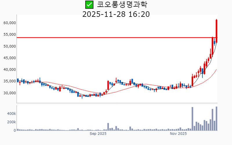 - 2025년 11월 28일기준 신고가 종목을 한눈에 볼 수 있도록 정리했습니다. - 실시간 신고가 종목은 Awake 신고가 종목 텔레그램 채널 https://t.me/awake_realtimeCheck 에서 확인하세요. - ⚡ 더욱 깊이있는 신고가 + 수급 정보를 원한다면 AWAKE 신고가 플러스를 이용해 보세요⚡ 👉 https://fishy-trampoline-79b.notion.site/1d175164780f803e93abc1e53c38b42c ⚡ 📌 신고가 종목 현황(2025-11-28기준) ✅ 로봇 (섹터강도 : 4.9) ⭐️⭐️⭐️ (상승률/거래대금) 종목명 (+29.9%/ 478억) 우림피티에스(52주) (+26.1%/ 3,393억) 에스피지(역사적) (+22.7%/ 1,260억) 에스비비테크(52주)/ 52주 최대거래 (+21.6%/ 9,682억) 고영(52주) (+20.7%/ 1,085억) 한국피아이엠(역사적) (+13.0%/ 103억) 아진엑스텍(52주) (+11.6%/ 4,021억) 한라캐스트(역사적) ( +8.3%/ 2,300억) 알트(역사적) ( +7.7%/ 61억) HL홀딩스(52주) ( +4.8%/ 397억) 스맥(역사적) ✅ 바이오/헬스케어 (섹터강도 : 4.7) ⭐️⭐️⭐️ (상승률/거래대금) 종목명 (+23.9%/ 2,754억) 코오롱티슈진(52주) (+23.1%/ 532억) 케어젠(역사적) (+19.8%/ 328억) 코오롱생명과학(52주) (+16.9%/ 330억) 메지온(52주) ( +8.7%/ 1,171억) 인투셀(역사적) ( +8.1%/ 714억) 에스티팜(52주) ( +7.9%/ 1,372억) 로킷헬스케어(역사적) ( +7.5%/ 4,586억) 에이비엘바이오(역사적) ( +7.0%/ 1,695억) 리가켐바이오(역사적) ( +6.1%/ 76억) 동구바이오제약(52주) ( +5.6%/ 358억) 퓨쳐켐(역사적) ( +4.5%/ 41억) 메디포스트(52주) ( +4.4%/ 181억) HK이노엔(52주) ( +4.2%/ 392억) 오스코텍(52주) ( +4.0%/ 217억) 큐리옥스바이오시스템즈(역사적) ( +4.0%/ 35억) 에이치이엠파마(역사적) ( +4.0%/ 350억) 한올바이오파마(52주) ( +4.0%/ 100억) 지놈앤컴퍼니(52주) ( +3.9%/ 100억) 큐리언트(역사적) ( +3.7%/ 622억) 바이젠셀(52주) ( +3.1%/ 248억) 넥스트바이오메디컬(역사적) ( +0.7%/ 254억) 씨어스테크놀로지(역사적) ( +0.5%/ 687억) SK바이오팜(52주) ✅ 의료AI (상승률/거래대금) 종목명 (+21.6%/ 9,682억) 고영(52주) ( +7.6%/ 113억) 쓰리빌리언(역사적) ( +0.7%/ 254억) 씨어스테크놀로지(역사적) ✅ 자동차 (상승률/거래대금) 종목명 (+24.4%/ 1,726억) 디아이씨(52주) ( +7.0%/ 100억) 코리아에프티(52주) ( +5.6%/ 227억) 현대위아(52주)/ 52주 최대거래 ( +5.0%/ 8억) BGF에코머티리얼즈(52주) ( +0.5%/ 32억) 금호타이어(52주) ✅ 반도체 (상승률/거래대금) 종목명 ( +8.6%/ 530억) ISC(역사적) ( +5.4%/ 781억) 리노공업(역사적) ( +4.1%/ 263억) 태성(52주) ( +0.4%/ 85억) 에프엔에스테크(52주) ✅ 밸류업 지수 (상승률/거래대금) 종목명 ( +7.7%/ 61억) HL홀딩스(52주) ( +3.4%/ 29억) 인카금융서비스(역사적) ( +3.0%/ 269억) 한국타이어앤테크놀로지(52주) ( +1.3%/ 2억) 일신방직(52주) ( +1.2%/ 10억) 방림(52주) ( +0.8%/ 47억) 한국앤컴퍼니(역사적) ✅ AI S/W (상승률/거래대금) 종목명 ( +7.6%/ 113억) 쓰리빌리언(역사적) ( +6.8%/ 54억) 플리토(역사적) ( +1.2%/ 2억) 케이티알파(52주) ✅ 창투사 (상승률/거래대금) 종목명 (+14.1%/ 118억) 미래에셋벤처투자(52주) ( +4.6%/ 7억) 스톤브릿지벤처스(52주) ----------------------------------- ![]() ✅ 에이비엘바이오(+7.5%) ❗️ 역사적 신고가 돌파 이어감 거래대금 : 4,596억 시가총액 : 10.4조 - 현재가 : 188,000원 이중항체 및 BBB 셔틀 기술을 중심으로 한 바이오의약품 개발 기업 글로벌 제약사와의 기술이전 및 파트너십을 통한 성장 가속화 면역항암제 및 신경계 질환 신약 개발로 인한 미래 성장동력 확보 📊 주요지표 부채비율 : 28% 유보율 : 497% PBR : 27.95배 📊 최근실적(매출/영업익/순익) 2025.3Q 14억/ -224억/ -213억 2025.2Q 757억/ 407억/ 398억 2025.1Q 22억/ -290억/ -281억 2024.4Q 91억/ -191억/ -191억 📊 당일 기관수급 요약 📌 기관합계 : +440억 - 사모 : +223억 - 금융투자 : +151억 - 투신 : +68억 - 은행 : 0억 - 기타금융 : 0억 - 보험 : 0억 - 연기금 : -3억 📌 외국인 : +363억 ![]() ✅ 한국타이어앤테크놀로지(+3.0%) ❗️ 52주 신고가 돌파 이어감 거래대금 : 269억 시가총액 : 7.6조 - 현재가 : 61,500원 타이어 제조 및 기술력 중심 글로벌 시장 리더십 전기차·대형차용 타이어 개발과 유럽 시장에서의 성능 입증 실적 성장과 주주환원 매력 강화 📊 주요지표 부채비율 : 102% 유보율 : 17,191% PBR : 0.41배 📊 최근실적(매출/영업익/순익) 2025.4Q 54,886억/ 5,311억/ 3,208억(E) 2025.3Q 54,127억/ 5,860억/ 3,896억 2025.2Q 53,697억/ 3,536억/ 1,788억 2025.1Q 49,637억/ 3,546억/ 3,122억 2024.4Q 25,315억/ 4,732억/ 4,732억 📊 당일 기관수급 요약 📌 기관합계 : +65억 - 연기금 : +50억 - 투신 : +11억 - 사모 : +6억 - 보험 : +2억 - 기타금융 : +0억 - 은행 : 0억 - 금융투자 : -6억 📌 외국인 : -32억 ![]() ✅ 코오롱티슈진(+23.9%) ❗️ 52주 신고가 돌파 이어감 거래대금 : 2,755억 시가총액 : 7.1조 - 현재가 : 85,400원 세포치료제 및 바이오 신약 개발 전문 기업 TG-C 기반 골관절염 치료제, 임상3상 성공 및 상업화 기대 미국·유럽 시장 진출 및 핵심 기술 특허 취득에 따른 성장 잠재력 확대 📊 주요지표 부채비율 : 140% 유보율 : 3,048,276% PBR : 28.93배 📊 최근실적(매출/영업익/순익) 2025.2Q 13억/ -55억/ -574억 2025.1Q 13억/ -54억/ -58억 2024.4Q 8억/ -65억/ -188억 2024.3Q 21억/ -58억/ -58억 📊 당일 기관수급 요약 📌 기관합계 : +83억 - 사모 : +54억 - 투신 : +34억 - 연기금 : +9억 - 보험 : +1억 - 기타금융 : +0억 - 은행 : 0억 - 금융투자 : -16억 📌 외국인 : +97억 ![]() ✅