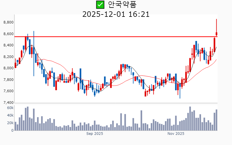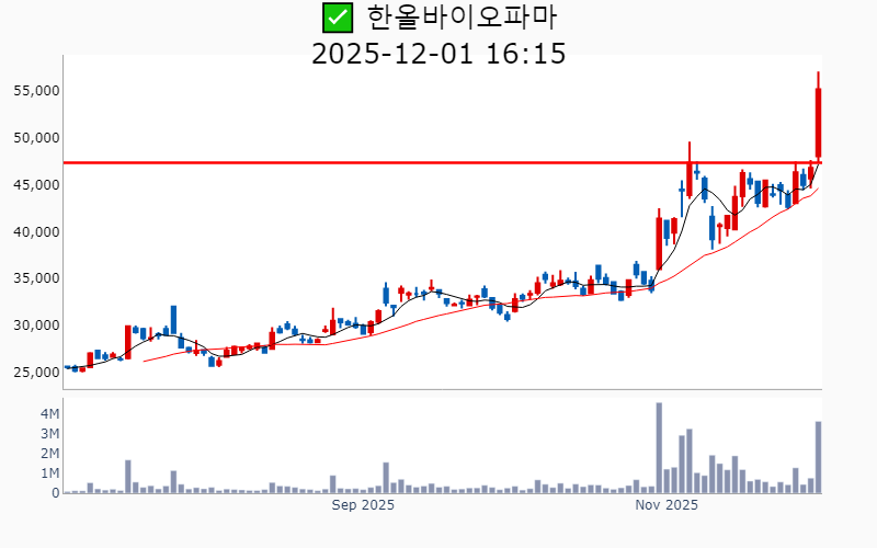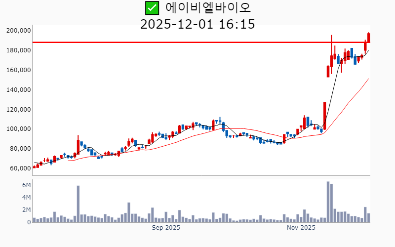 - 2025년 12월 1일기준 신고가 종목을 한눈에 볼 수 있도록 정리했습니다. - 실시간 신고가 종목은 Awake 신고가 종목 텔레그램 채널 https://t.me/awake_realtimeCheck 에서 확인하세요. - ⚡ 더욱 깊이있는 신고가 + 수급 정보를 원한다면 AWAKE 신고가 플러스를 이용해 보세요⚡ 👉 https://fishy-trampoline-79b.notion.site/1d175164780f803e93abc1e53c38b42c ⚡ 📌 신고가 종목 현황(2025-12-01기준) ✅ 바이오/헬스케어 (섹터강도 : 4.4) ⭐️⭐️ [상승률/거래대금] 종목명 [+28.9%/ 376억] 아이티켐(역사적) [+17.9%/ 1,909억] 한올바이오파마(역사적) [+11.6%/ 401억] 바이젠셀(52주) [ +9.7%/ 388억] 오름테라퓨틱(역사적) [ +7.3%/ 192억] 앱클론(52주) [ +6.8%/ 100억] 큐리언트(역사적) [ +5.8%/ 52억] 에이치이엠파마(역사적) [ +5.7%/ 112억] 지노믹트리(52주) [ +4.7%/ 2,839억] 에이비엘바이오(역사적) [ +4.2%/ 187억] 넥스트바이오메디컬(역사적) [ +4.0%/ 28억] 메디포스트(52주) [ +2.9%/ 682억] 프로티나(역사적) [ +2.4%/ 18억] 제일파마홀딩스(52주) [ +2.2%/ 790억] 코오롱티슈진(52주) [ +1.5%/ 345억] 보로노이(역사적) [ +1.3%/ 1,049억] 리가켐바이오(역사적) [ +1.0%/ 197억] HK이노엔(52주) [ +0.8%/ 128억] 메지온(52주) [ +0.3%/ 22억] 이수앱지스(52주) ✅ 로봇 (섹터강도 : 4.3) ⭐️⭐️ [상승률/거래대금] 종목명 [+18.3%/ 1,479억] 우림피티에스(52주)/ 52주 최대거래 [+15.7%/ 1,372억] 씨피시스템(역사적) [+12.6%/ 656억] 한국피아이엠(역사적) [+11.4%/ 3,920억] 한라캐스트(역사적) [+10.6%/ 1.1조] 고영(52주) [ +8.6%/ 153억] 더블유에스아이(52주) [ +7.0%/ 486억] 에스피시스템스(52주) [ +3.5%/ 208억] 링크솔루션(역사적) [ +3.4%/ 368억] 큐렉소(52주) [ +3.0%/ 49억] HL홀딩스(52주) [ +1.7%/ 5,634억] 클로봇(역사적) ✅ 반도체 (섹터강도 : 4.2) ⭐️⭐️ [상승률/거래대금] 종목명 [+17.5%/ 304억] 경인양행(52주)/ 52주 최대거래 [+15.7%/ 704억] 코리아써키트(역사적) [+10.8%/ 391억] 에이디테크놀로지(52주) [+10.0%/ 270억] 삼영(역사적) [ +5.2%/ 101억] 티에스이(52주) [ +4.2%/ 148억] 한솔케미칼(52주) [ +2.3%/ 40억] 티에프이(역사적) [ +1.5%/ 33억] 사피엔반도체(52주) [ +1.4%/ 35억] 인터플렉스(52주) ✅ 자동차/부품 [상승률/거래대금] 종목명 [+10.2%/ 118억] 티에이치엔(역사적) [ +9.9%/ 1,104억] HL만도(52주)/ 52주 최대거래 [ +5.2%/ 1,393억] 디아이씨(52주) [ +2.7%/ 4억] 두올(52주) [ +2.0%/ 65억] 코리아에프티(52주) ✅ 의료AI [상승률/거래대금] 종목명 [+10.6%/ 1.1조] 고영(52주) [ +2.9%/ 682억] 프로티나(역사적) [ +2.0%/ 92억] 뷰노(52주) [ +1.5%/ 345억] 보로노이(역사적) [ +1.4%/ 120억] 쓰리빌리언(역사적) ✅ 밸류업 지수 ⭐️ [상승률/거래대금] 종목명 [ +7.6%/ 190억] 신세계(52주) [ +6.6%/ 173억] 현대백화점(52주) [ +3.4%/ 800억] 우리금융지주(역사적) [ +3.0%/ 49억] HL홀딩스(52주) [ +2.8%/ 8억] 대원산업(역사적) [ +0.8%/ 10억] 삼지전자(52주) [ +0.7%/ 41억] 제일기획(52주) [ +0.2%/ 6억] 아세아(역사적) [ +0.2%/ 8억] 동성케미컬(52주) ✅ 폴더블/모바일 [상승률/거래대금] 종목명 [ +3.0%/ 102억] 동운아나텍(52주) [ +2.0%/ 56억] 유티아이(52주) [ +1.4%/ 35억] 인터플렉스(52주) [ +0.7%/ 35억] 에이치엔에스하이텍(52주) ✅ AI S/W [상승률/거래대금] 종목명 [ +2.5%/ 49억] 플리토(역사적) [ +1.4%/ 120억] 쓰리빌리언(역사적) [ +1.2%/ 7억] 케이티알파(52주) ----------------------------------- ![]() ✅ 우리금융지주(+3.4%) ❗️ 역사적 신고가 다시 돌파 거래대금 : 800억 시가총액 : 20.2조 - 현재가 : 27,450원 금융지주사로서 종합금융 플랫폼 구축 및 혁신 금융 서비스 강화. 생산적 금융을 통한 첨단산업 지원 및 2조원 규모 펀드로 미래 성장동력 확보. AI 혁신 및 리스크 관리 강화로 지속 가능한 성장 추구. 📊 주요지표 부채비율 : 1,395% 유보율 : 753% PBR : 0.48배 📊 최근실적(매출/영업익/순익) 2025.3Q -/ 11,920억/ 10,146억(E) 2025.2Q 135,387억/ 11,085억/ 9,397억 2025.1Q 96,252억/ 8,693억/ 6,546억 2024.4Q 154,851억/ 6,742억/ 4,541억 2024.3Q 74,216억/ 11,770억/ 11,770억 📊 당일 기관수급 요약 📌 기관합계 : +102억 - 투신 : +55억 - 연기금 : +28억 - 금융투자 : +10억 - 사모 : +7억 - 보험 : +1억 - 은행 : 0억 - 기타금융 : 0억 📌 외국인 : +96억 ![]() ✅ 에이비엘바이오(+4.7%) ❗️ 역사적 신고가 돌파 이어감 거래대금 : 2,842억 시가총액 : 10.8조 - 현재가 : 196,800원 이중항체 기반의 바이오테크 기업으로 면역항암제 및 신약 개발 주도 일라이 릴리와의 3.8조 원 규모 기술이전 계약으로 글로벌 파트너십 강화 BBB 셔틀 플랫폼과 그랩바디 기술로 혁신적 신약 개발 및 시장 확장 가능성 📊 주요지표 부채비율 : 28% 유보율 : 497% PBR : 27.95배 📊 최근실적(매출/영업익/순익) 2025.3Q 14억/ -224억/ -213억 2025.2Q 757억/ 407억/ 398억 2025.1Q 22억/ -290억/ -281억 2024.4Q 91억/ -191억/ -191억 📊 당일 기관수급 요약 📌 기관합계 : +177억 - 금융투자 : +144억 - 사모 : +36억 - 은행 : 0억 - 기타금융 : 0억 - 연기금 : 0억 - 보험 : 0억 - 투신 : -2억 📌 외국인 : +31억 ![]() ✅ 한올바이오파마(+17.9%) ❗️ 52주 신고가 돌파 이어감 거래대금 : 1,909억 시가총액 : 2.9조 - 현재가 : 55,200원 자가면역질환 및 안과질환 치료제 개발 중심 바이오 제약 기업 FcRn 억제제 '바토클리맙' 및 'HL161' 글로벌 임상 진행으로 신약 상용화 기대 파트너사 M&A 및 R&D 투자 확대를 통한 성장 동력 확보 📊 주요