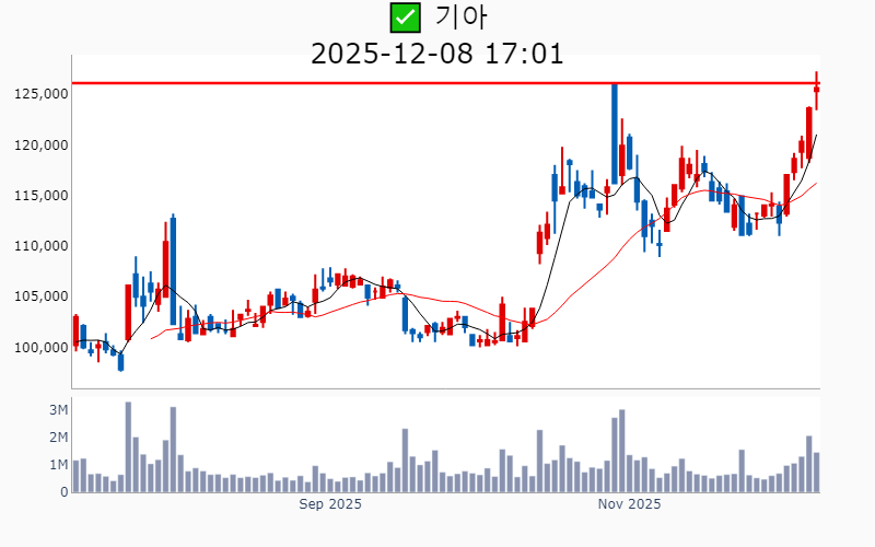 - 2025년 12월 8일기준 신고가 종목을 한눈에 볼 수 있도록 정리했습니다. - 실시간 신고가 종목은 Awake 신고가 종목 텔레그램 채널 https://t.me/awake_realtimeCheck 에서 확인하세요. - ⚡ 더욱 깊이있는 주도주 정보를 원한다면 AWAKE 마켓스타PRO ⭐️를 이용해 보세요⚡ 👉 https://fishy-trampoline-79b.notion.site/1d175164780f803e93abc1e53c38b42c ⚡ 📌 신고가 종목 현황(2025-12-08기준) ✅ 로봇 (섹터강도 : 4.5) ⭐️⭐️ [상승률/거래대금] 종목명 [+24.1%/ 1,438억] 에스피시스템스(52주) [+18.0%/ 833억] 링크솔루션(역사적) [+15.6%/ 674억] 에스비비테크(52주) [+14.9%/ 2,307억] 디아이씨(역사적) [+13.7%/ 928억] 우림피티에스(역사적) [+12.6%/ 1,818억] 에스피지(역사적) [ +8.7%/ 3,341억] 클로봇(역사적) [ +7.6%/ 165억] 와이투솔루션(52주) [ +7.2%/ 260억] 이랜시스(52주) [ +6.5%/ 1,736억] 현대오토에버(역사적) [ +5.8%/ 547억] 삼현(역사적) [ +1.8%/ 22억] 아진엑스텍(52주) [ +1.6%/ 2,602억] 로보티즈(역사적) [ +1.5%/ 101억] SNT모티브(52주) [ +0.2%/ 5,853억] 현대차(역사적) ✅ 2차전지 [상승률/거래대금] 종목명 [+21.3%/ 2.2조] 에코프로(52주)/ 52주 최대거래 ✅ 바이오/헬스케어 (섹터강도 : 4.0) ⭐️⭐️ [상승률/거래대금] 종목명 [+30.0%/ 521억] 바이젠셀(52주) [+21.5%/ 807억] 대화제약(52주) [ +7.4%/ 180억] 엘앤케이바이오(52주) [ +7.3%/ 1,299억] 이뮨온시아(역사적) [ +6.8%/ 65억] 이지케어텍(52주) [ +5.9%/ 743억] 에스티팜(52주) ✅ 냉각 [상승률/거래대금] 종목명 [+30.0%/ 545억] 성호전자(역사적) ✅ 반도체 [상승률/거래대금] 종목명 [+12.8%/ 1,450억] 켐트로스(52주)/ 52주 최대거래 [ +7.1%/ 355억] 경인양행(52주)/ 52주 최대거래 [ +5.8%/ 212억] 브이엠(역사적) [ +0.8%/ 97억] 에이팩트(52주) [ +0.5%/ 310억] 코리아써키트(역사적) [ +0.4%/ 9억] 야스(52주) ✅ 자동차/부품 [상승률/거래대금] 종목명 [+14.9%/ 2,307억] 디아이씨(역사적) [ +6.5%/ 9억] BGF에코머티리얼즈(52주) [ +5.8%/ 547억] 삼현(역사적) [ +1.6%/ 1,835억] 기아(52주) [ +1.4%/ 136억] 현대위아(52주) [ +1.2%/ 186억] 에스엘(역사적) [ +0.7%/ 9억] 피에이치에이(52주) [ +0.4%/ 13억] 넥센타이어(52주) [ +0.2%/ 5,853억] 현대차(역사적) ✅ 밸류업 지수 [상승률/거래대금] 종목명 [ +6.2%/ 53억] 에이플러스에셋(52주) [ +3.1%/ 1,232억] 삼성물산(역사적) [ +2.9%/ 8억] 대원산업(역사적) [ +2.7%/ 36억] 영원무역홀딩스(역사적) [ +1.6%/ 10억] INVENI(역사적) [ +1.6%/ 1,835억] 기아(52주) [ +1.5%/ 101억] SNT모티브(52주) [ +0.5%/ 4억] 일신방직(52주) [ +0.4%/ 58억] 제일기획(52주) [ +0.2%/ 5,853억] 현대차(역사적) ✅ 건설/주택 [상승률/거래대금] 종목명 [ +3.1%/ 1,232억] 삼성물산(역사적) [ +1.8%/ 10억] 자이에스앤디(52주) [ +0.6%/ 4억] HS화성(52주) ✅ 창투사 [상승률/거래대금] 종목명 [ +7.7%/ 110억] 미래에셋벤처투자(52주) [ +1.9%/ 8억] 스톤브릿지벤처스(52주) [ +0.3%/ 40억] 에이티넘인베스트(52주) ✅ 대북 [상승률/거래대금] 종목명 [ +1.6%/ 222억] 재영솔루텍(52주) [ +1.3%/ 247억] 현대엘리베이터(역사적) [ +0.8%/ 5억] 인지컨트롤스(52주) ----------------------------------- ![]() ✅ 기아(+1.6%) ❗️ 52주 신고가 신규 돌파 거래대금 : 1,835억 시가총액 : 49.0조 - 현재가 : 125,600원 전기차 및 PBV 중심의 글로벌 모빌리티 리더 K-배터리 협력과 E-GMP 플랫폼 기반 전기차 안전 및 효율성 강화 스마트도시 및 재생에너지 등 지속가능한 모빌리티 솔루션 확대 📊 주요지표 부채비율 : 66% 유보율 : 2,577% PBR : 0.66배 📊 최근실적(매출/영업익/순익) 2025.4Q 288,337억/ 20,581억/ 16,491억(E) 2025.3Q 286,860억/ 14,623억/ 14,225억 2025.2Q 293,496억/ 27,648억/ 22,682억 2025.1Q 280,175억/ 30,086억/ 23,926억 2024.4Q 271,481억/ 27,164억/ 27,164억 📊 당일 기관수급 요약 📌 기관합계 : +76억 - 사모 : +68억 - 보험 : +45억 - 연기금 : +36억 - 투신 : +7억 - 기타금융 : +0억 - 은행 : +0억 - 금융투자 : -82억 📌 외국인 : +368억 ![]() ✅ 에코프로(+21.3%) ❗️ 52주 신고가 신규 돌파 거래대금 : 2.2조 시가총액 : 16.0조 - 현재가 : 117,500원 이차전지 소재 및 친환경 사업 다각화로 성장 모색. 유럽 및 인도네시아 투자 통해 글로벌 시장 확대 및 원가 경쟁력 강화. 고전압 미드니켈 양산 준비로 차세대 배터리 기술 리더십 확보. 📊 주요지표 부채비율 : 108% 유보율 : 7,980% PBR : 3.98배 📊 최근실적(매출/영업익/순익) 2025.3Q 9,594억/ 1,494억/ 1,739억 2025.2Q 9,317억/ 162억/ -380억 2025.1Q 8,068억/ 14억/ -108억 2024.4Q 6,489억/ -998억/ -998억 📊 당일 기관수급 요약 📌 기관합계 : +176억 - 투신 : +136억 - 사모 : +77억 - 연기금 : +75억 - 보험 : +2억 - 은행 : 0억 - 기타금융 : 0억 - 금융투자 : -114억 📌 외국인 : +3,391억 ![]() ✅ 현대오토에버(+6.5%) ❗️ 역사적 신고가 돌파 이어감 거래대금 : 1,736억 시가총액 : 8.3조 - 현재가 : 302,000원 IT 서비스 및 솔루션을 제공하는 현대차그룹 계열사 엔비디아와의 AI 협력 및 자율주행 기술 개발로 모빌리티 혁신 주도 글로벌 시장 확장과 디지털 전환 가속화로 지속 성장 가능성 증대 📊 주요지표 부채비율 : 81% 유보율 : 12,826% PBR : 2.34배 📊 최근실적(매출/영업익/순익) 2025.4Q 12,276억/ 808억/ 695억(E) 2025.3Q 10,543억/ 708억/ 528억 2025.2Q 10,421억/ 814억/ 597억 2025.1Q 8,330억/ 267억/ 199억 2024.4Q 11,596억/ 727억/ 727억 📊 당일 기관수급 요약 📌 기관합계 : +39억 - 연기금 : +45억 - 투신 