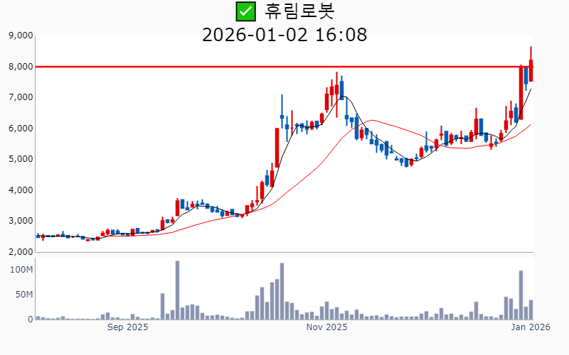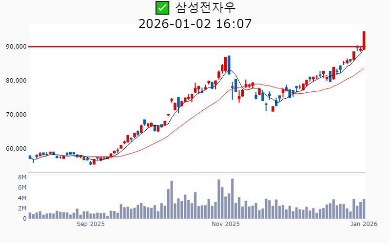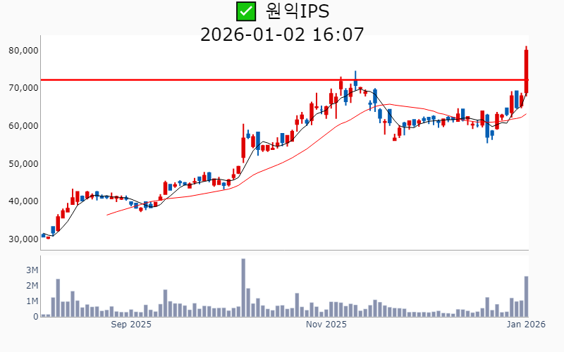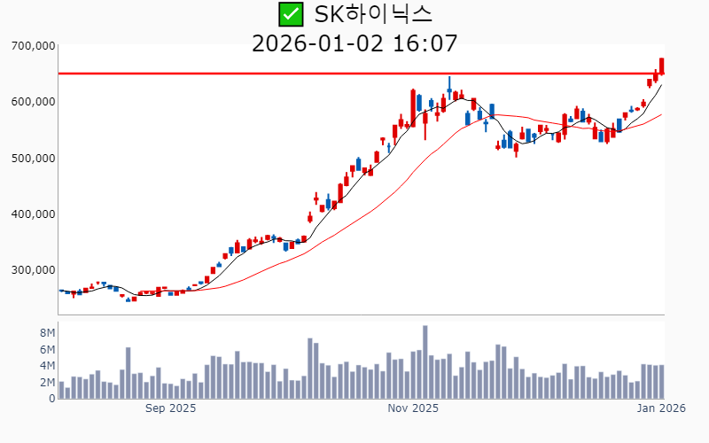 - 2026년 1월 2일기준 신고가 종목을 한눈에 볼 수 있도록 정리했습니다. - 실시간 신고가 종목은 Awake 신고가 종목 텔레그램 채널 https://t.me/awake_realtimeCheck 에서 확인하세요. - ⚡ 더욱 깊이있는 주도주 정보를 원한다면 AWAKE 마켓스타PRO ⭐️를 이용해 보세요⚡ 👉 https://fishy-trampoline-79b.notion.site/1d175164780f803e93abc1e53c38b42c ⚡ 📌 신고가 종목 현황(2026-01-02기준) ✅ 반도체 (섹터강도 : 4.8) ⭐️⭐️⭐️ [상승률/거래대금] 종목명 [+19.4%/ 461억] 테스(역사적) [+17.8%/ 2,007억] 원익IPS(역사적) [+16.3%/ 5,184억] 제주반도체(52주) [+10.1%/ 103억] 티에스이(52주) [ +9.4%/ 219억] 에스티아이(52주) [ +9.3%/ 32억] 퓨릿(52주) [ +9.0%/ 485억] DB하이텍(52주) [ +8.0%/ 361억] ISC(역사적) [ +7.2%/ 3.7조] 삼성전자(역사적) [ +6.7%/ 243억] 켐트로스(52주) [ +6.5%/ 1,615억] SK스퀘어(역사적) [ +5.8%/ 3,531억] 삼성전자우(역사적) [ +5.4%/ 333억] GST(52주) [ +4.0%/ 2.8조] SK하이닉스(역사적) [ +2.0%/ 4억] 야스(52주) [ +1.7%/ 284억] 두산테스나(52주) [ +1.0%/ 212억] 브이엠(역사적) ✅ 우주항공 (섹터강도 : 4.5) ⭐️⭐️ [상승률/거래대금] 종목명 [+29.9%/ 1,440억] 스피어(52주) [+29.9%/ 1,041억] 쎄트렉아이(역사적)/ 52주 최대거래 [+18.5%/ 316억] 파이버프로(역사적) [+14.6%/ 416억] 인텔리안테크(52주) [+13.9%/ 897억] 에이치브이엠(역사적) [+11.3%/ 638억] 세아베스틸지주(역사적) [ +5.8%/ 35억] 한양이엔지(52주) [ +5.2%/ 1,560억] 켄코아에어로스페이스(52주) [ +2.1%/ 740억] 한국항공우주(역사적) [ +0.1%/ 678억] 비츠로넥스텍(역사적) ✅ 바이오/헬스케어 (섹터강도 : 4.1) ⭐️⭐️ [상승률/거래대금] 종목명 [+20.4%/ 336억] 아미노로직스(52주)/ 52주 최대거래 [+15.1%/ 385억] 앱클론(역사적) [+11.9%/ 87억] 지놈앤컴퍼니(52주) [+11.9%/ 6,838억] 셀트리온(52주)/ 52주 최대거래 [+11.5%/ 53억] DXVX(52주) [ +7.8%/ 99억] 지노믹트리(52주) [ +7.3%/ 36억] 코미팜(52주) [ +3.1%/ 54억] 안트로젠(52주) [ +2.1%/ 147억] 큐리옥스바이오시스템즈(역사적) ✅ 로봇 (섹터강도 : 4.0) ⭐️⭐️ [상승률/거래대금] 종목명 [+30.0%/ 201억] LS티라유텍(52주) [+26.1%/ 3,967억] 현대무벡스(역사적) [+11.4%/ 2,571억] HL만도(52주)/ 52주 최대거래 [ +9.9%/ 3,195억] 휴림로봇(52주) [ +5.5%/ 35억] 액트로(역사적) [ +1.5%/ 270억] 디아이씨(역사적) [ +1.2%/ 108억] 더블유에스아이(52주) ✅ 밸류업 지수 ⭐️ [상승률/거래대금] 종목명 [+29.9%/ 166억] 네오오토(역사적) [+12.4%/ 112억] 피에스텍(역사적) [ +9.0%/ 485억] DB하이텍(52주) [ +6.5%/ 1,615억] SK스퀘어(역사적) [ +3.6%/ 2억] 미창석유(역사적) ✅ 대북 [상승률/거래대금] 종목명 [+10.2%/ 1,179억] 재영솔루텍(역사적) [ +1.9%/ 6억] 인지컨트롤스(52주) ----------------------------------- ![]() ✅ 삼성전자(+7.2%) ❗️ 역사적 신고가 돌파 이어감 거래대금 : 3.7조 시가총액 : 760.7조 - 현재가 : 128,500원 반도체 및 전자제품 제조 분야의 글로벌 리더 AI 및 반도체 기술을 통한 차세대 메모리와 스토리지 시장 확대 엔비디아와의 협력 및 HBM4 기술로 반도체 경쟁력 강화 📊 주요지표 부채비율 : 26% 유보율 : 43,418% PBR : 1.38배 📊 최근실적(매출/영업익/순익) 2025.4Q 873,774억/ 157,964억/ 153,800억(E) 2025.3Q 860,617억/ 121,661억/ 122,257억 2025.2Q 745,663억/ 46,761억/ 51,164억 2025.1Q 791,405억/ 66,853억/ 82,229억 2024.4Q 757,883억/ 64,927억/ 64,927억 📊 당일 기관수급 요약 📌 기관합계 : -1,154억 - 은행 : -2억 - 기타금융 : -4억 - 보험 : -122억 - 사모 : -153억 - 금융투자 : -176억 - 연기금 : -194억 - 투신 : -501억 📌 외국인 : +2,983억 ![]() ✅ SK하이닉스(+4.0%) ❗️ 역사적 신고가 돌파 이어감 거래대금 : 2.8조 시가총액 : 492.9조 - 현재가 : 677,000원 메모리 반도체 및 D램, NAND 플래시 중심의 글로벌 반도체 기업 HBM 전담 기술 조직 신설 및 AI 메모리 시장 공략 강화 2026년 조직 개편 통한 글로벌 역량 및 기술 혁신 추진 📊 주요지표 부채비율 : 48% 유보율 : 2,636% PBR : 2.4배 📊 최근실적(매출/영업익/순익) 2025.4Q 289,721억/ 147,692억/ 133,328억(E) 2025.3Q 244,489억/ 113,834억/ 125,975억 2025.2Q 222,320억/ 92,129억/ 69,962억 2025.1Q 176,391억/ 74,405억/ 81,082억 2024.4Q 197,670억/ 80,828억/ 80,828억 📊 당일 기관수급 요약 📌 기관합계 : -309억 - 연기금 : +368억 - 투신 : +116억 - 사모 : +55억 - 은행 : +5억 - 기타금융 : -3억 - 보험 : -153억 - 금융투자 : -698억 📌 외국인 : -730억 ![]() ✅ 삼성전자우(+5.8%) ❗️ 역사적 신고가 돌파 이어감 거래대금 : 3,541억 시가총액 : 77.0조 - 현재가 : 94,400원 반도체 및 전자제품 제조 중심 글로벌 기술 기업 고배당 정책과 외국인 투자자 선호로 인한 안정적 투자 매력 메모리 슈퍼사이클 전망에 따른 장기적 성장 가능성 확보 📊 주요지표 부채비율 : 26% 유보율 : 43,418% PBR : 1.38배 📊 최근실적(매출/영업익/순익) 2025.4Q 888,839억/ 158,444억/ 152,435억(E) 2025.3Q 860,617억/ 121,661억/ 122,257억 2025.2Q 745,663억/ 46,761억/ 51,164억 2025.1Q 791,405억/ 66,853억/ 82,229억 2024.4Q 757,883억/ 64,927억/ 64,927억 📊 당일 기관수급 요약 📌 기관합계 : +720억 - 연기금 : +534억 - 사모 : +109억 - 금융투자 : +35억 - 투신 : +29억 - 보험 : +16억 - 은행 : 0억 - 기타금융 : -5억 📌 외국인 : +732억 ![]() ✅ SK스퀘어(+6.5%) ❗️ 역사적 신고가 돌파 이어감 거래대금 : 1,615억 시가총액 : 51.8조 - 현재가 : 392,000원 지주사 구조 기반