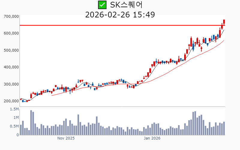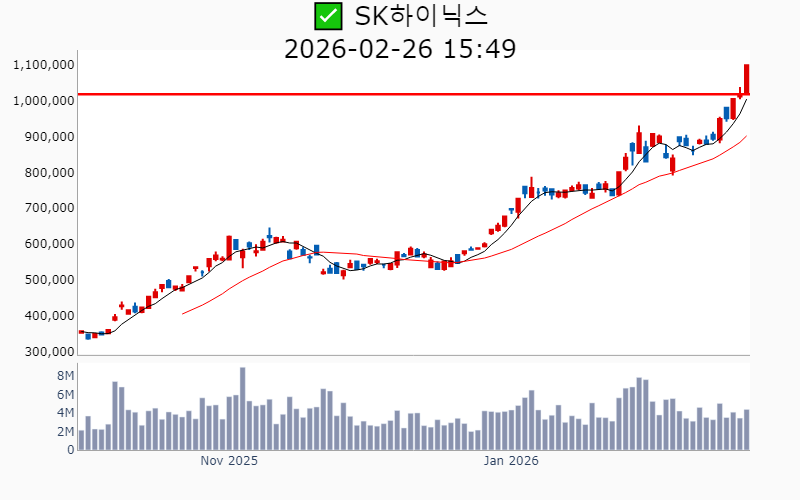 - 2026년 2월 26일기준 신고가 종목을 한눈에 볼 수 있도록 정리했습니다. - 실시간 신고가 종목은 Awake 신고가 종목 텔레그램 채널 https://t.me/awake_realtimeCheck 에서 확인하세요. - ⚡ 더욱 깊이있는 주도주 정보를 원한다면 AWAKE 마켓스타PRO ⭐️를 이용해 보세요⚡ 👉 https://fishy-trampoline-79b.notion.site/1d175164780f803e93abc1e53c38b42c ⚡ 📌 신고가 종목 현황(2026-02-26기준) ✅ 반도체 (섹터강도 : 4.9) ⭐️⭐️⭐️ [상승률/거래대금] 종목명 [+29.8%/ 17억] 펨트론(역사적) [+28.4%/ 1.5조] 한미반도체(역사적) [+19.6%/ 811억] 에스티아이(역사적) [+16.6%/ 1.3조] 제주반도체(역사적)/ 52주 최대거래 [+16.3%/ 4,413억] SFA반도체(52주)/ 52주 최대거래 [+15.4%/ 516억] 엠디바이스(역사적) [+13.5%/ 6,025억] 한화비전(역사적) [+12.7%/ 84억] 제이아이테크(52주)/ 52주 최대거래 [+12.6%/ 1,031억] 이오테크닉스(역사적) [+12.3%/ 637억] 유진테크(역사적) [+11.1%/ 360억] 피에스케이홀딩스(역사적) [+10.9%/ 131억] 성도이엔지(역사적)/ 52주 최대거래 [+10.4%/ 145억] 매커스(역사적) [+10.0%/ 350억] 티씨케이(52주) [ +9.9%/ 2,028억] 리노공업(역사적) [ +8.0%/ 4.6조] SK하이닉스(역사적) [ +7.9%/ 396억] 피에스케이(역사적) [ +7.8%/ 98억] 디엔에프(52주)/ 52주 최대거래 [ +7.6%/ 108억] 기가비스(52주) [ +7.5%/ 699억] 미래반도체(52주) [ +7.1%/ 6.4조] 삼성전자(역사적) [ +6.6%/ 140억] 케이씨텍(52주) [ +6.5%/ 64억] 에스에이엠티(52주) [ +6.4%/ 115억] 마이크로컨텍솔(역사적) [ +6.0%/ 62억] 디아이티(52주) [ +5.9%/ 18억] 메카로(52주) [ +5.7%/ 431억] ISC(역사적) [ +5.6%/ 45억] 에프엔에스테크(역사적) [ +5.4%/ 488억] 파두(역사적) [ +5.3%/ 97억] 싸이맥스(52주) [ +5.0%/ 5,110억] SK스퀘어(역사적) [ +4.7%/ 28억] 제이스텍(52주) [ +4.7%/ 501억] 와이씨(역사적) [ +4.7%/ 157억] 원익QnC(52주) [ +4.3%/ 2,769억] 두산(역사적) [ +4.2%/ 496억] 어보브반도체(52주) [ +3.6%/ 1,135억] 네오셈(역사적) [ +3.5%/ 205억] 한솔케미칼(52주) [ +3.2%/ 308억] 두산테스나(역사적) [ +3.2%/ 212억] 한양이엔지(역사적) [ +3.2%/ 1,261억] 대덕전자(역사적) [ +2.9%/ 410억] 브이엠(역사적) [ +1.2%/ 54억] 예스티(52주) [ +0.6%/ 102억] 월덱스(역사적) [ +0.3%/ 3,902억] 삼성전기(역사적) ✅ 금융/지주/밸류업 ⭐️ [상승률/거래대금] 종목명 [+29.9%/ 357억] 상상인증권(52주) [+18.5%/ 184억] 경동인베스트(52주) [+12.7%/ 4,596억] 현대모비스(역사적) [+10.4%/ 145억] 매커스(역사적) [+10.1%/ 6,644억] LG전자(52주) [ +8.2%/ 9억] 세원정공(52주) [ +7.3%/ 141억] 코오롱(52주) [ +7.0%/ 26억] 대원산업(역사적) [ +6.8%/ 820억] 유화증권(역사적)/ 역대 최대거래 [ +6.5%/ 1.7조] 현대차(역사적) [ +6.0%/ 29억] 케이씨(역사적) [ +5.3%/ 1,538억] DB손해보험(역사적)/ 52주 최대거래 [ +5.0%/ 4,009억] 기아(역사적) [ +5.0%/ 5,110억] SK스퀘어(역사적) [ +4.7%/ 173억] 태광산업(52주) [ +4.3%/ 2,769억] 두산(역사적) [ +4.2%/ 10억] 신세계푸드(52주) [ +3.8%/ 2,185억] 삼성물산(역사적) [ +3.5%/ 734억] LG(52주) [ +3.3%/ 1,695억] SK(역사적) [ +3.2%/ 18억] 대덕(역사적) [ +2.4%/ 238억] LG유플러스(52주) [ +2.2%/ 49억] HDC(52주) [ +2.1%/ 304억] 한국타이어앤테크놀로지(역사적) [ +1.3%/ 6억] 삼영전자(52주) [ +1.2%/ 26억] 삼양홀딩스(52주) [ +1.1%/ 61억] 효성(역사적) [ +0.5%/ 6억] 유성티엔에스(52주) [ +0.2%/ 3,028억] POSCO홀딩스(52주) [ +0.1%/ 763억] 한화(역사적) ✅ 로봇 (섹터강도 : 4.0) ⭐️⭐️ [상승률/거래대금] 종목명 [+17.9%/ 576억] 한국피아이엠(역사적) [+12.7%/ 4,596억] 현대모비스(역사적) [+11.7%/ 5,140억] 레인보우로보틱스(역사적) [ +6.5%/ 1.7조] 현대차(역사적) [ +5.0%/ 564억] KEC(52주) [ +3.0%/ 22억] 대성하이텍(52주) [ +2.3%/ 102억] 에스에프에이(52주) [ +1.6%/ 613억] KH바텍(52주) [ +0.9%/ 47억] 케이피에프(52주) ----------------------------------- ![]() ✅ 삼성전자(+7.1%) ❗️ 역사적 신고가 돌파 이어감 거래대금 : 6.4조 시가총액 : 1290.5조 - 현재가 : 218,000원 📊 최근 애널리스트 리포트 요약 📌 삼성전자, 메모리 가격 폭등에 힘입어 놀라운 실적과 밝은 전망 - 삼성전자의 2026년 1분기 실적이 매출 111조 원, 영업이익 31조 원으로 시장 기대치를 크게 상회할 전망입니다. - DRAM과 NAND 가격이 각각 45%, 50% 급등하며 메모리 부문에서의 실적 개선을 이끌었습니다. - DRAM 공정 전환 및 eSSD, 서버 DRAM 수요 증가가 메모리 가격 협상에 긍정적 영향을 미쳤습니다. - 목표 주가는 18.7만 원으로 상향 조정되었으며, 이는 글로벌 평균 대비 여전히 매력적인 수준입니다. (출처 : 미래에셋증권/유진투자증권/SK증권) 📊 주요지표 부채비율 : 29% 유보율 : 45,296% PBR : 1.87배 📊 최근실적(매출/영업익/순익) 2026.1Q 1,129,412억/ 336,299억/ 270,229억(E) 2025.4Q 938,374억/ 200,737억/ 196,417억 2025.3Q 860,617억/ 121,661억/ 122,257억 2025.2Q 745,663억/ 46,761억/ 51,164억 2025.1Q 791,405억/ 66,853억/ 66,853억 ![]() ✅ SK하이닉스(+8.0%) ❗️ 역사적 신고가 돌파 이어감 거래대금 : 4.6조 시가총액 : 783.3조 - 현재가 : 1,099,000원 📊 최근 애널리스트 리포트 요약 📌 SK하이닉스, 메모리 시장의 새로운 강자로 떠오르다 - SK하이닉스의 목표주가는 95.6만원으로 22.3% 상승, 2026년 영업이익은 128조원으로 17.9% 상향했습니다. - DRAM과 NAND의 공급부족으로 인해 가격 상승이 예상되며, DRAM 가격은 추가 상승 가능성이 큽니다. - 2026년 DRAM과 NAND의 영업이익은 각