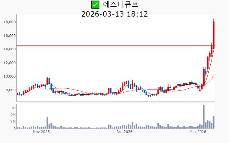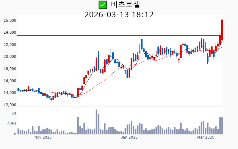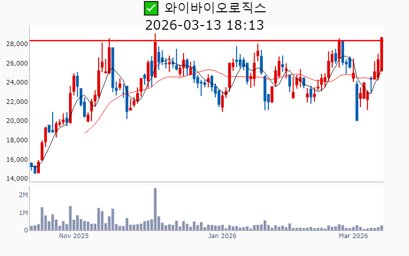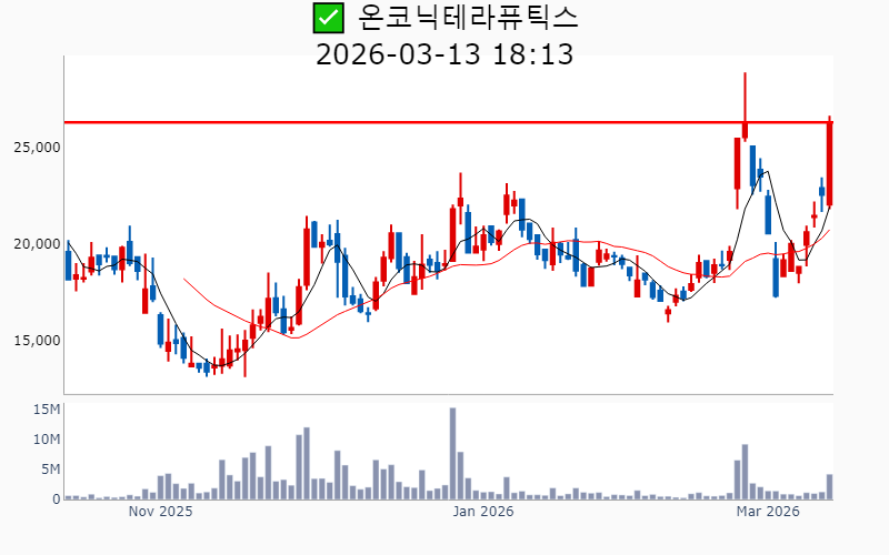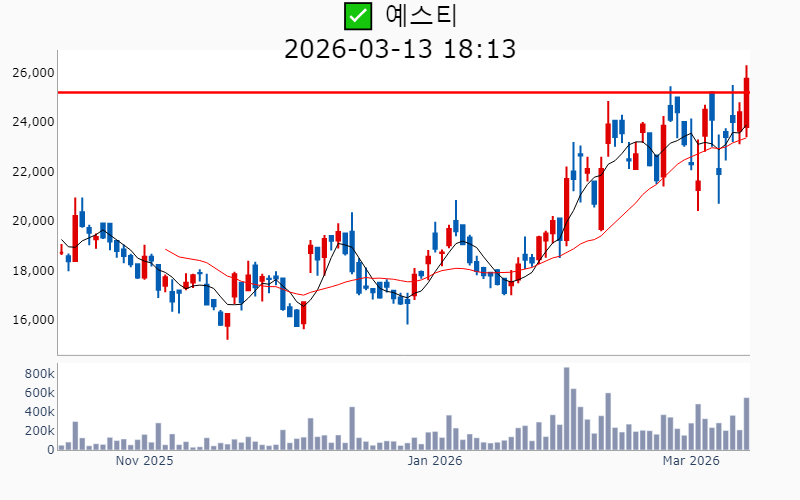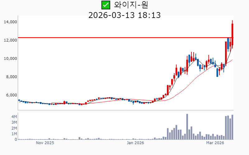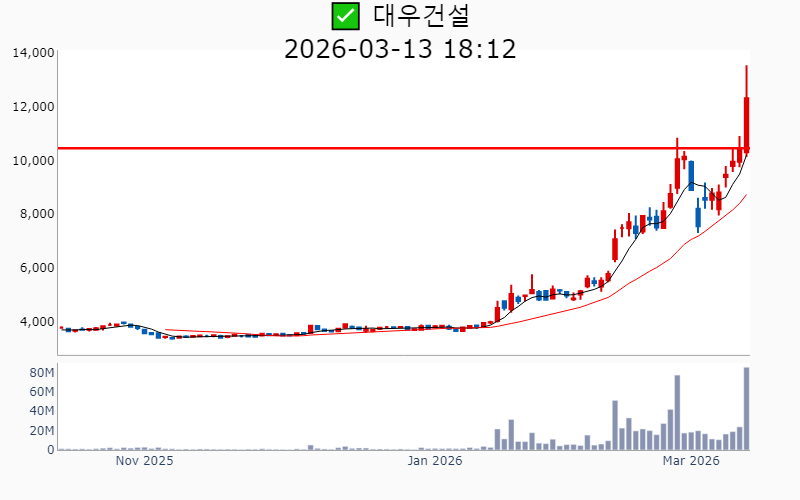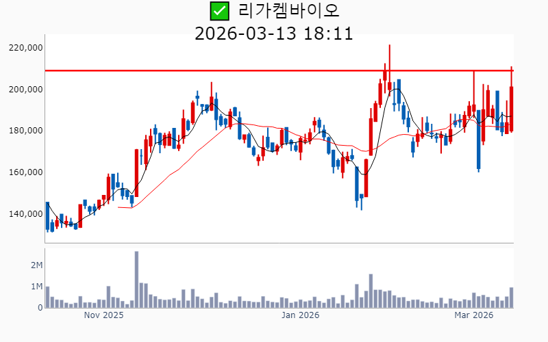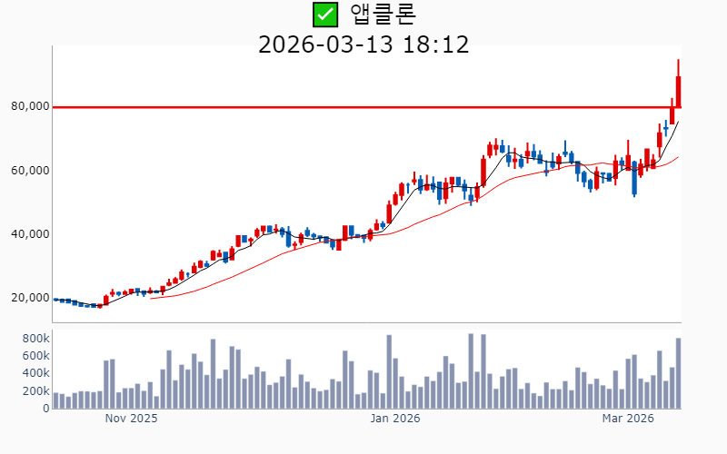 - 2026년 3월 13일기준 신고가 종목을 한눈에 볼 수 있도록 정리했습니다. - 실시간 신고가 종목은 Awake 신고가 종목 텔레그램 채널 https://t.me/awake_realtimeCheck 에서 확인하세요. - ⚡ 더욱 깊이있는 주도주 정보를 원한다면 AWAKE 마켓스타PRO ⭐️를 이용해 보세요⚡ 👉 https://fishy-trampoline-79b.notion.site/1d175164780f803e93abc1e53c38b42c ⚡ 📌 신고가 종목 현황(2026-03-13기준) ✅ 바이오/헬스케어 (섹터강도 : 4.2) ⭐️⭐️ [상승률/거래대금] 종목명 [+24.5%/ 310억] 에스티큐브(52주) [+16.2%/ 1,048억] 온코닉테라퓨틱스(역사적) [+14.2%/ 596억] 국전약품(52주) [+13.7%/ 118억] 바이오솔루션(52주) [+11.9%/ 699억] 앱클론(역사적) [+11.3%/ 467억] 보로노이(역사적) [ +9.4%/ 1,926억] 리가켐바이오(역사적) [ +8.7%/ 77억] 와이바이오로직스(역사적) [ +7.3%/ 84억] 큐라클(52주) [ +7.2%/ 1,799억] 알지노믹스(역사적) [ +4.8%/ 53억] 비트컴퓨터(52주) [ +4.7%/ 1,042억] 지투지바이오(역사적) [ +2.1%/ 3억] 제일파마홀딩스(52주) [ +0.4%/ 30억] 휴온스글로벌(역사적) [ +0.1%/ 378억] 큐리언트(역사적) ✅ 원전 (섹터강도 : 4.5) ⭐️⭐️ [상승률/거래대금] 종목명 [+17.8%/ 1.1조] 대우건설(역사적)/ 역대 최대거래 [+11.6%/ 1.4조] 우리기술(역사적) [ +5.6%/ 4,436억] 현대건설(역사적) [ +5.4%/ 541억] 지투파워(52주) [ +3.9%/ 1,614억] 오르비텍(52주) [ +2.9%/ 9,979억] 두산에너빌리티(역사적) ✅ 희토류 ⭐️ [상승률/거래대금] 종목명 [+30.0%/ 508억] RF시스템즈(역사적) [+12.8%/ 167억] 코스텍시스(역사적) [ +9.7%/ 149억] 제이에스링크(역사적) [ +6.8%/ 267억] RF머트리얼즈(역사적) [ +4.0%/ 309억] 티플랙스(52주) [ +4.0%/ 313억] 그린리소스(52주) [ +0.8%/ 36억] 풍국주정(52주) ----------------------------------- ![]() ✅ 에이피알(+6.2%) ❗️ 역사적 신고가 돌파 이어감 거래대금 : 1,410억 시가총액 : 12.8조 - 현재가 : 342,500원 📊 최근 애널리스트 리포트 요약 📌 [기술력과 마케팅으로 뷰티테크 선두주자, 에이피알의 도약!] - 에이피알은 자체 R&D센터를 통해 기술 내재화에 성공하며, 300여 건의 특허를 보유하고 있습니다. - 2025년 4분기 매출 4,838억 원, 영업이익 1,161억 원으로 예상되며, 미국 시장에서의 성과가 두드러집니다. - 메디큐브는 아마존에서 높은 성과를 기록하며, 2026년 매출 60% 성장이 기대됩니다. - 유럽 시장 진출을 본격화하며, 글로벌 뷰티테크 리더로서의 입지를 강화할 전망입니다. (출처 : 교보증권/유안타증권/유진투자증권/미래에셋증권) 📊 주요지표 부채비율 : 76% 유보율 : 8,819% PBR : 26.84배 📊 최근실적(매출/영업익/순익) 2025.4Q 4,696억/ 1,136억/ 932억(E) 2025.3Q 3,859억/ 961억/ 746억 2025.2Q 3,277억/ 846억/ 663억 2025.1Q 2,660억/ 546억/ 499억 2024.4Q 2,442억/ 397억/ 397억 ![]() ✅ 리가켐바이오(+9.4%) ❗️ 역사적 신고가 신규 돌파 거래대금 : 1,926억 시가총액 : 7.4조 - 현재가 : 201,000원 📊 최근 애널리스트 리포트 요약 📌 2026년 임상결과 기대감과 플랫폼딜로 기업가치 상승, 리가켐바이오의 미래 - 리가켐바이오는 목표주가를 230,000원으로 상향 조정하며, 6개의 신약 파이프라인 가치가 주목받고 있습니다. - LCB14(HER2 ADC)의 2026년 중국 허가 신청과 LCB84의 연내 임상 1상 종료가 기대됩니다. - 플랫폼딜이 발전된 형태로 진행 중이며, 다양한 기술 접근성으로 높은 규모의 계약이 예상됩니다. - PBD Prodrug 사용으로 안전성 개선이 기대되며, STING agonist LCB39도 부작용 해소 가능성이 높습니다. (출처 : 유진투자증권/미래에셋증권/유안타증권) 📊 주요지표 부채비율 : 24% 유보율 : 2,892% PBR : 9.23배 📊 최근실적(매출/영업익/순익) 2025.4Q 289억/ -72억/ -16억(E) 2025.3Q 414억/ -232억/ -153억 2025.2Q 326억/ -216억/ -381억 2025.1Q 516억/ 114억/ 265억 2024.4Q 337억/ -137억/ -137억 ![]() ✅ 대우건설(+17.8%) ❗️ 역사적 신고가 돌파 이어감 거래대금 : 1.1조 시가총액 : 5.1조 - 현재가 : 12,320원 📊 최근 애널리스트 리포트 요약 📌 대우건설, 체코 원전 수주로 해외 시장 진출 준비 완료 - 대우건설은 2026년 체코 원전 수주를 통해 첫 해외 대형 원전 시공 계약을 기대하고 있습니다. - 2025년 4분기 실적은 매출액 2.1조 원, 영업이익 811억 원으로 예상되며 시장 기대치를 밑돌 것으로 보입니다. - 주택부문 경쟁력과 2026년 주택시장 회복 전망이 주가 안정에 긍정적 영향을 미칠 것으로 예상됩니다. (출처 : 한화투자증권/IBK투자증권/하나증권) 📊 주요지표 부채비율 : 228% 유보율 : 130% PBR : 0.36배 📊 최근실적(매출/영업익/순익) 2025.4Q 20,141억/ 880억/ 484억(E) 2025.3Q 19,906억/ 566억/ -530억 2025.2Q 22,733억/ 822억/ -429억 2025.1Q 20,767억/ 1,513억/ 580억 2024.4Q 26,470억/ 1,212억/ 1,212억 ![]() ✅ 우리기술(+11.6%) ❗️ 역사적 신고가 돌파 이어감 거래대금 : 1.4조 시가총액 : 4.1조 - 현재가 : 24,450원 📊 주요지표 부채비율 : 144% 유보율 : 52% PBR : 4.91배 📊 최근실적(매출/영업익/순익) 2025.3Q 212억/ -6억/ -33억 2025.2Q 226억/ -7억/ 202억 2025.1Q 185억/ -30억/ -55억 2024.4Q 259억/ 38억/ 38억 ![]() ✅ 알지노믹스(+7.2%) ❗️ 54일 신고가 신규 돌파 거래대금 : 1,799억 시가총액 : 2.7조 - 현재가 : 192,600원 📊 주요지표 부채비율 : 28% 유보율 : 105% PBR : -배 📊 최근실적(매출/영업익/순익) 2025.3Q / -81억/ -82억 2025.2Q 71억/ 31억/ -851억 2025.1Q / -41억/ -53억 2024.4Q / -26억/ -2