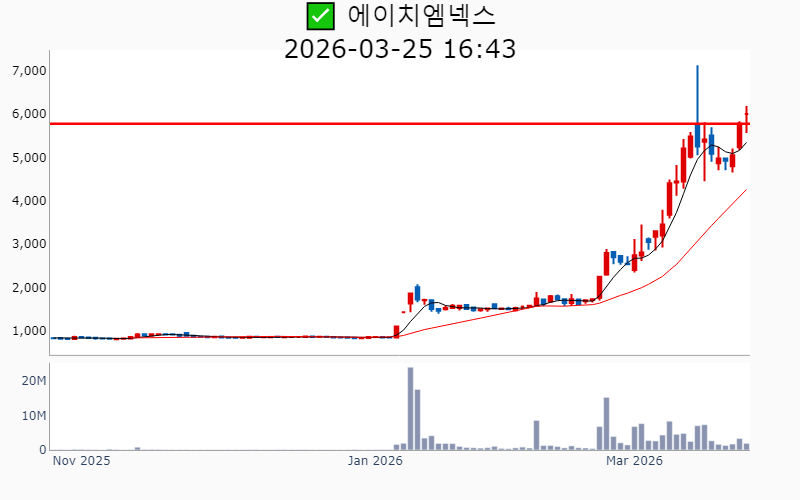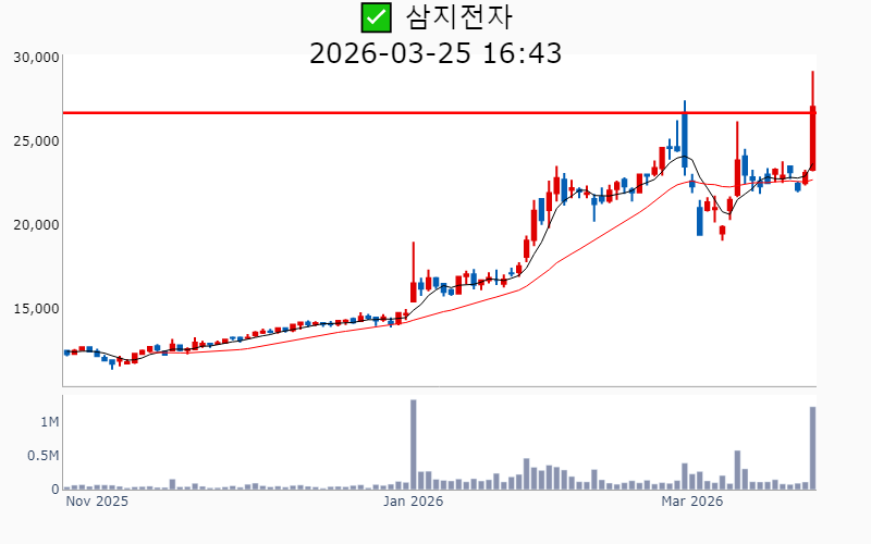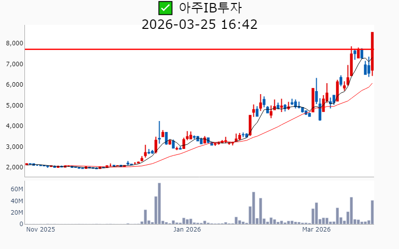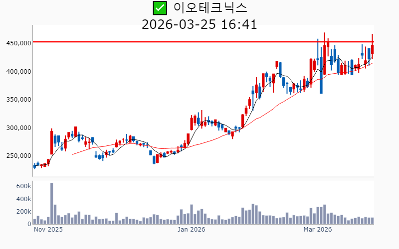 - 2026년 3월 25일기준 신고가 종목을 한눈에 볼 수 있도록 정리했습니다. - 실시간 신고가 종목은 Awake 신고가 종목 텔레그램 채널 https://t.me/awake_realtimeCheck 에서 확인하세요. - ⚡ 더욱 깊이있는 주도주 정보를 원한다면 AWAKE 마켓스타PRO ⭐️를 이용해 보세요⚡ 👉 https://fishy-trampoline-79b.notion.site/1d175164780f803e93abc1e53c38b42c ⚡ 📌 신고가 종목 현황(2026-03-25기준) ✅ 반도체 (섹터강도 : 4.7) ⭐️⭐️⭐️ [상승률/거래대금] 종목명 [+21.9%/ 1,156억] 코리아써키트(역사적) [+16.8%/ 220억] 오킨스전자(52주) [+14.7%/ 264억] 한양디지텍(역사적) [+14.4%/ 112억] 에프엔에스테크(역사적) [+14.4%/ 118억] 프로텍(52주) [+14.2%/ 2,097억] 대덕전자(역사적) [+13.5%/ 105억] 네오티스(역사적) [+13.3%/ 183억] 엘티씨(역사적) [+12.2%/ 39억] 메카로(52주) [+11.7%/ 2,986억] 한화비전(역사적) [+11.7%/ 195억] 아비코전자(52주) [+10.1%/ 126억] 네패스(52주) [ +8.8%/ 146억] 티에프이(역사적) [ +8.6%/ 1,020억] 두산(역사적) [ +7.8%/ 333억] 네패스아크(52주) [ +7.4%/ 160억] HB테크놀러지(52주) [ +7.1%/ 76억] 지앤비에스 에코(52주) [ +6.2%/ 77억] 싸이맥스(52주) [ +5.9%/ 411억] 티엘비(역사적) [ +5.5%/ 314억] 피에스케이(역사적) [ +5.4%/ 468억] 이오테크닉스(역사적) [ +5.1%/ 76억] 인터플렉스(52주) [ +4.8%/ 476억] ISC(역사적) [ +4.0%/ 110억] 에이치엠넥스(역사적) [ +3.5%/ 5억] 아이씨디(52주) [ +1.7%/ 426억] 브이엠(역사적) [ +1.4%/ 434억] 에이디테크놀로지(역사적) ✅ 통신장비/6G (섹터강도 : 4.0) ⭐️⭐️ [상승률/거래대금] 종목명 [+29.8%/ 270억] 우리로(역사적) [+22.0%/ 1,184억] 오이솔루션(52주) [+19.4%/ 7,873억] 쏠리드(역사적)/ 역대 최대거래 [+16.0%/ 1,183억] RFHIC(역사적) [+15.3%/ 422억] 케이엠더블유(52주) [+15.0%/ 243억] 유비쿼스(52주) [+14.5%/ 285억] 에치에프알(52주) [+14.1%/ 259억] 이노와이어리스(52주) [+11.2%/ 3,687억] 대한광통신(역사적) [ +6.2%/ 468억] 와이어블(52주)/ 52주 최대거래 [ +1.3%/ 352억] 에이스테크(52주) [ +0.2%/ 770억] 머큐리(52주)/ 52주 최대거래 ✅ 바이오/헬스케어 ⭐️ [상승률/거래대금] 종목명 [+23.7%/ 655억] 옵투스제약(역사적) [+19.2%/ 291억] 녹십자웰빙(52주) [+19.1%/ 4,038억] 삼천당제약(역사적) [+16.6%/ 1,159억] 경보제약(52주) [+14.7%/ 169억] 에스티큐브(52주) [+12.3%/ 68억] 코미팜(52주) [ +9.2%/ 176억] 삼양바이오팜(역사적) [ +5.8%/ 42억] 하이텍팜(역사적) [ +5.3%/ 839억] 알지노믹스(역사적) [ +4.7%/ 671억] 리가켐바이오(역사적) [ +0.9%/ 93억] 지놈앤컴퍼니(52주) [ +0.8%/ 107억] 티움바이오(52주) ----------------------------------- ![]() ✅ 효성중공업(+10.7%) ❗️ 역사적 신고가 다시 돌파 거래대금 : 2,322억 시가총액 : 27.9조 - 현재가 : 2,990,000원 📊 투자포인트 - 전력망 안정기술을 바탕으로 세계 최대 1GVar 스태콤 수주에 성공한 호재. - 미국 공장 풀가동 및 한국 공장 생산 확대에 따른 글로벌 시장 진출 가속화 기대감. 📊 주요지표 부채비율 : 190% 유보율 : 3,693% PBR : 7.05배 📊 최근실적(매출/영업익/순익) 2026.1Q 13,439억/ 1,758억/ 1,187억(E) 2025.4Q 17,430억/ 2,605억/ 1,601억 2025.3Q 16,241억/ 2,198억/ 1,518억 2025.2Q 15,253억/ 1,643억/ 873억 2025.1Q 10,761억/ 1,024억/ 1,024억 ![]() ✅ 삼천당제약(+19.1%) ❗️ 역사적 신고가 돌파 이어감 거래대금 : 4,038억 시가총액 : 26.2조 - 현재가 : 1,115,000원 📊 투자포인트 - 경구용 위고비 제네릭 유럽 상업화 5.3조 계약 체결로 인한 기대감. - 아일리아 바이오시밀러 수익 기반 차세대 신약 R&D 투자 강화. 📊 주요지표 부채비율 : 49% 유보율 : 2,173% PBR : 18.73배 📊 최근실적(매출/영업익/순익) 2025.3Q 580억/ 34억/ 45억 2025.2Q 569억/ -11억/ -16억 2025.1Q 506억/ 7억/ 13억 2024.4Q 552억/ -5억/ -5억 ![]() ✅ 두산(+8.6%) ❗️ 역사적 신고가 다시 돌파 거래대금 : 1,020억 시가총액 : 20.2조 - 현재가 : 1,250,000원 📊 투자포인트 - 대형 원전과 SMR을 포함한 해외 원전 수주 확대 기대감에 따른 긍정적 전망. - 미국 기업과의 가스터빈 대규모 공급 계약 체결에 따른 수주 기대감. 📊 주요지표 부채비율 : 164% 유보율 : 1,651% PBR : 5.64배 📊 최근실적(매출/영업익/순익) 2025.4Q 56,754억/ 4,458억/ 2,350억(E) 2025.3Q 44,524억/ 2,313억/ 1,115억 2025.2Q 53,464억/ 3,578억/ 2,332억 2025.1Q 42,987억/ 1,985억/ 113억 2024.4Q 51,998억/ 2,089억/ 2,089억 ![]() ✅ 엘앤에프(+16.2%) ❗️ 52주 신고가 신규 돌파 거래대금 : 3,420억 시가총액 : 5.9조 - 현재가 : 145,300원 📊 투자포인트 - 삼성SDI에 1.6조원 규모 LFP 양극재 공급 계약 체결에 따른 기대감. - 하이니켈 양극재 판매량 증가 및 LFP 양극재 기반의 중장기 모멘텀 강화 전망. 📊 주요지표 부채비율 : 363% 유보율 : 3,065% PBR : 5.45배 📊 최근실적(매출/영업익/순익) 2026.1Q 6,635억/ 424억/ 270억(E) 2025.4Q 6,178억/ 825억/ -1,926억 2025.3Q 6,523억/ 221억/ -1,183억 2025.2Q 5,201억/ -1,212억/ -1,126억 2025.1Q 3,648억/ -1,403억/ -1,403억 ![]() ✅ 이오테크닉스(+5.4%) ❗️ 역사적 신고가 다시 돌파 거래대금 : 468억 시가총액 : 5.5조 - 현재가 : 446,500원 📊 투자포인트 - 삼성전자와 SK하이닉스와의 독점적 공급 계약 체결 가능성에 따른 기대감. - NAND 고단화 수혜로 반도체 장비 부문 실적 개선세 지속 전망. 📊 주요지표 부채비율 : 12% 유보율 : 10,628% PBR : 4.30배 📊 최근실적(매출/영업익/순익) 2025.4Q 994억/ 218억/ -(E) 2025.3Q 1,005억/ 260억/ 