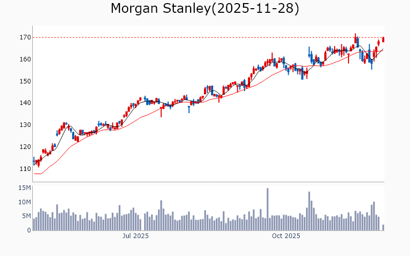 * Financials Morgan Stanley / Capital Markets / 269.6B Royal Bank of Canada / Banks - Diversified / 215.7B Citigroup Inc / Banks - Diversified / 185.4B Toronto-Dominion Bank / Banks - Diversified / 143.0B Sumitomo Mitsui Financial Group Inc / Banks - Diversified / 115.6B Bank of Nova Scotia / Banks - Diversified / 85.7B Nu Holdings Ltd / Banks - Regional / 84.3B Barclays PLC / Banks - Diversified / 78.8B Bank of New York Mellon Corp / Banks - Diversified / 78.1B Itau Unibanco Holding SA / Banks - Regional / 77.8B Lloyds Banking Group PLC / Banks - Regional / 75.3B NatWest Group PLC / Banks - Regional / 67.0B Prudential PLC / Insurance - Life / 36.8B ORIX Corp / Financial Conglomerates / 30.2B Synchrony Financial / Credit Services / 27.9B Banco Santander Brasil SA / Banks - Regional / 23.9B Citizens Financial Group Inc / Banks - Regional / 23.2B Banco de Chile / Banks - Regional / 19.1B Affiliated Managers Group Inc / Asset Management / 7.6B Cadence Bank / Banks - Regional / 7.4B OneMain Holdings Inc / Credit Services / 7.3B Manulife Financial Corp / Asset Management / 3.1B * Materials Barrick Mining Corp / Gold / 69.2B Vale SA / Other Industrial Metals & Mining / 53.0B Nucor Corp / Steel / 36.5B Kinross Gold Corp / Gold / 33.0B Steel Dynamics Inc / Steel / 24.6B Sociedad Quimica y Minera de Chile SA / Specialty Chemicals / 18.4B Pan American Silver Corp / Gold / 17.9B Alamos Gold Inc / Gold / 15.5B Albemarle Corp / Specialty Chemicals / 15.3B Albemarle Corp / Specialty Chemicals / 15.3B Cemex SAB de CV / Building Materials / 14.9B Hecla Mining Co / Other Precious Metals & Mining / 11.3B Equinox Gold Corp / Gold / 10.7B Sibanye Stillwater Ltd / Other Precious Metals & Mining / 9.2B IAMGOLD Corp / Gold / 8.9B Eldorado Gold Corp / Gold / 6.2B * Industrials Parker-Hannifin Corp / Specialty Industrial Machinery / 108.7B 3M Co / Conglomerates / 91.4B Quanta Services Inc / Engineering & Construction / 69.3B Quanta Services Inc / Engineering & Construction / 69.3B Cummins Inc / Specialty Industrial Machinery / 68.7B Ferrovial SE / Engineering & Construction / 47.0B Rockwell Automation Inc / Specialty Industrial Machinery / 44.4B UL Solutions Inc / Specialty Business Services / 18.3B Woodward Inc / Aerospace & Defense / 18.0B APi Group Corp / Engineering & Construction / 16.4B RBC Bearings Inc / Tools & Accessories / 14.0B Wesco International Inc / Industrial Distribution / 13.0B Dycom Industries Inc / Engineering & Construction / 10.5B Danaos Corp / Marine Shipping / 1.8B * Energy TotalEnergies SE / Oil & Gas Integrated / 141.3B Enterprise Products Partners LP / Oil & Gas Midstream / 70.8B MPLX LP / Oil & Gas Midstream / 55.3B Baker Hughes Co / Oil & Gas Equipment & Services / 49.5B EQT Corp / Oil & Gas Exploration & Production / 38.0B Expand Energy Corp / Oil & Gas Exploration & Production / 29.0B TechnipFMC PLC / Oil & Gas Equipment & Services / 18.3B Western Midstream Partners LP / Oil & Gas Midstream / 16.1B DT Midstream Inc / Oil & Gas Midstream / 12.3B Sunoco LP / Oil & Gas Refining & Marketing / 10.6B APA Corp (US) / Oil & Gas Exploration & Production / 8.9B * Healthcare Amgen Inc / Drug Manufacturers - General / 186.0B Amgen Inc / Drug Manufacturers - General / 186.0B Teva Pharmaceutical Industries Ltd / Drug Manufacturers - Specialty & Generic / 30.9B Biogen Inc / Drug Manufacturers - General / 26.7B Revolution Medicines Inc / Biotechnology / 15.0B BridgeBio Pharma Inc / Biotechnology / 13.9B Ionis Pharmaceuticals Inc / Biotechnology / 13.4B Avidity Biosciences Inc / Biotechnology / 10.8B Axsome Therapeutics Inc / Biotechnology / 7.6B Merus NV / Biotechnology / 7.3B * Utilities Sempra / Utilities - Diversified / 61.8B Dominion Energy Inc / Utilities - Regulated Electric / 53.6B Entergy Corp / Utilities - Regulated Electric / 44.1B Ameren Corp / Utilities - Regulated Electric / 28.8B FirstEnergy Corp / Utilities - Regulated Electric / 27.6B Fortis Inc / Utilities - Regulated Electric / 26.2B CMS Energy Corp / Utilities - Regulated Electric / 23.0B Alliant Energy Corp / Utilities - Regulated Electric / 17.9B UGI Corp / Utilities - Regulated Gas / 8.5B * Technology Apple Inc / Consumer Electronics / 4120.0B Broadcom Inc / Semiconductors / 1900.0B Applied Materials Inc / Semiconductor Equipment & Materials / 200.9B Analog Devices Inc / Semiconductors / 129.9B Analog Devices Inc / Semiconductors / 129.9B Coherent Corp / Scientific & Technical Instruments / 25.8B Lumentum Holdings Inc / Communication Equipment / 23.1B Tower Semiconductor Ltd / Semiconductors / 12.1B TTM Technologies Inc / Electronic Components / 7.2B * Real Estate Welltower Inc / REIT - Healthcare Facilities / 142.9B Prologis Inc / REIT - Industrial / 122.3B Ventas Inc / REIT - Healthcare Facilities / 38.1B Annaly Capital Management Inc / REIT - Mortgage / 15.6B Omega Healthcare Investors Inc / REIT - Healthcare Facilities / 14.1B AGNC Investment Corp / REIT - Mortgage / 11.2B American Healthcare REIT Inc / REIT - Healthcare Facilities / 9.1B CareTrust REIT Inc / REIT - Healthcare Facilities / 8.4B * Consumer Staples Walmart Inc / Discount Stores / 881.1B Coca-Cola Co / Beverages - Non-Alcoholic / 314.5B British American Tobacco plc / Tobacco / 127.3B Ambev SA / Beverages - Brewers / 40.1B Kellanova / Packaged Foods / 29.1B * Consumer Discretionary Marriott International Inc / Lodging / 81.8B General Motors Co / Auto Manufacturers / 68.9B General Motors Co / Auto Manufacturers / 68.9B Restaurant Brands International Inc / Restaurants / 32.9B ![]() ✅ Morgan Stanley(1.0%) ❗️ 역사적 신고가 돌파 Sector : Financials Industry : Capital Markets 종목코드 : MS 시가총액 : 269.6B(372.1조원) 기업개요 ' - 글로벌 금융 서비스 제공업체로 투자은행, 자산관리, 자본시장 등 다양한 사업영역 보유 - 최근 자산관리 부문에서 강력한 성장세를 보이며 매출 기반 확대 - 주요 성장동력은 자산관리와 투자은행 부문의 지속적인 확장 --------------------